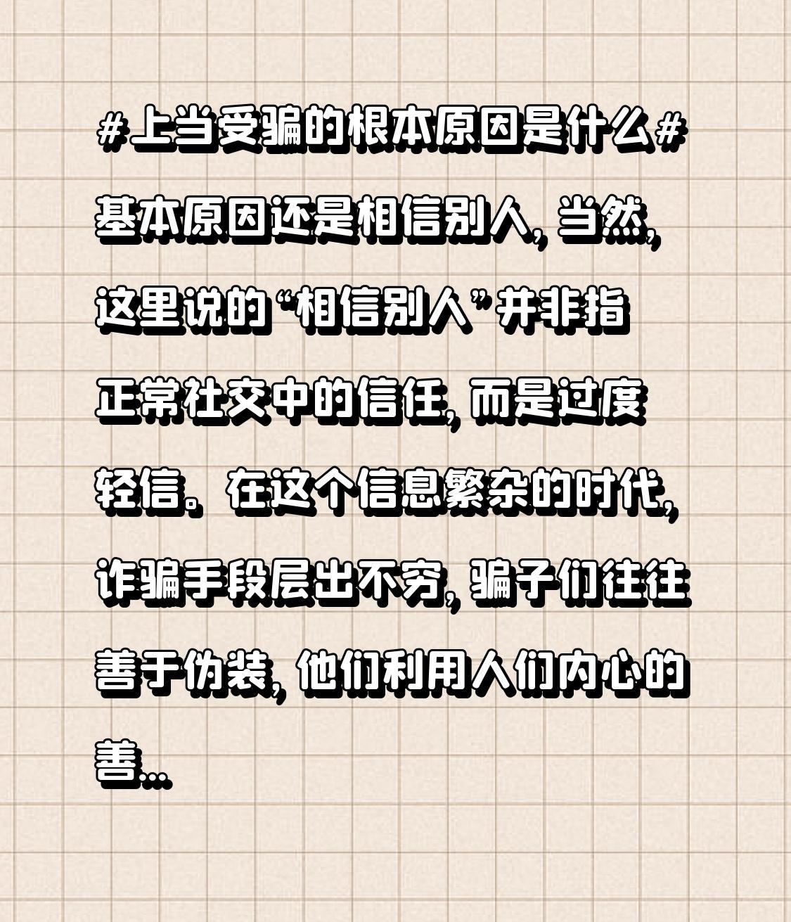 有些人会因为轻信陌生人所谓的“投资高回报”承诺,将自己的积蓄拱手相送。他们没有去深入了解投资项目的真实性和可行性,仅仅凭借骗子的花言巧语就轻易相信,最终血本无归。还有些人在面对一些打着“权威机构”幌子的诈骗时,不敢质疑,盲目听从安排,结果陷入了诈骗的漩涡。 过度相信别人还体现在对他人身份的不加核实上。骗子可能伪装成快递员、客服等,以各种理由诱导人们转账汇款或者提供个人信息。而人们往往因为没有多留个心眼去确认对方的身份,就轻易地按照对方的要求去做了。 要避免上当受骗,我们需要学会保持理性和警惕,在与人交往和面对各种信息时,多问几个为什么,不盲目相信,才能更好地守护好自己的财产和安全。