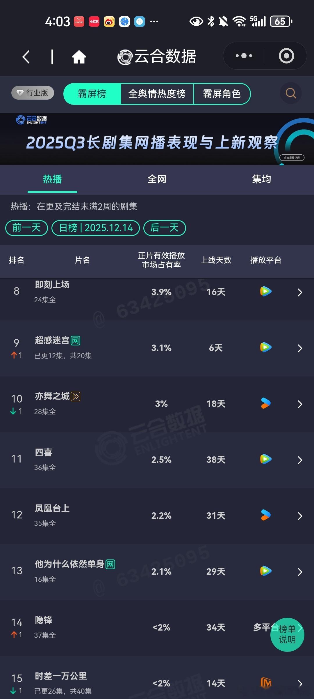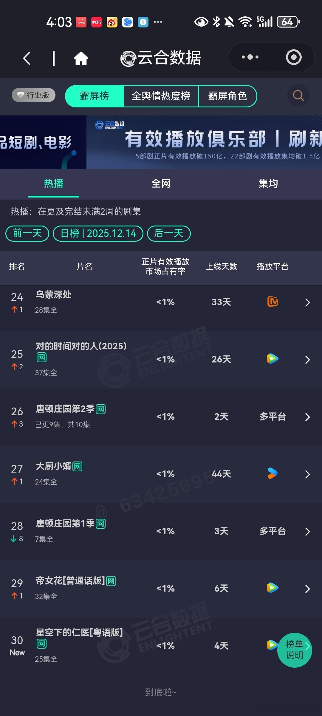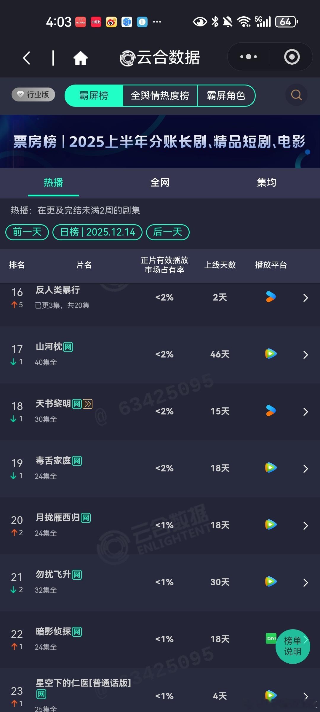 12月14日云合播放占比云合 大生意人16.8%狙击蝴蝶13.3%没想到这部剧还能在第二名待这么久长安二十四计10.6%第三天就开始有横盘趋势了,不大妙啊双轨10.5%上行乏力了。这两部剧看这情况,也不是很妙。