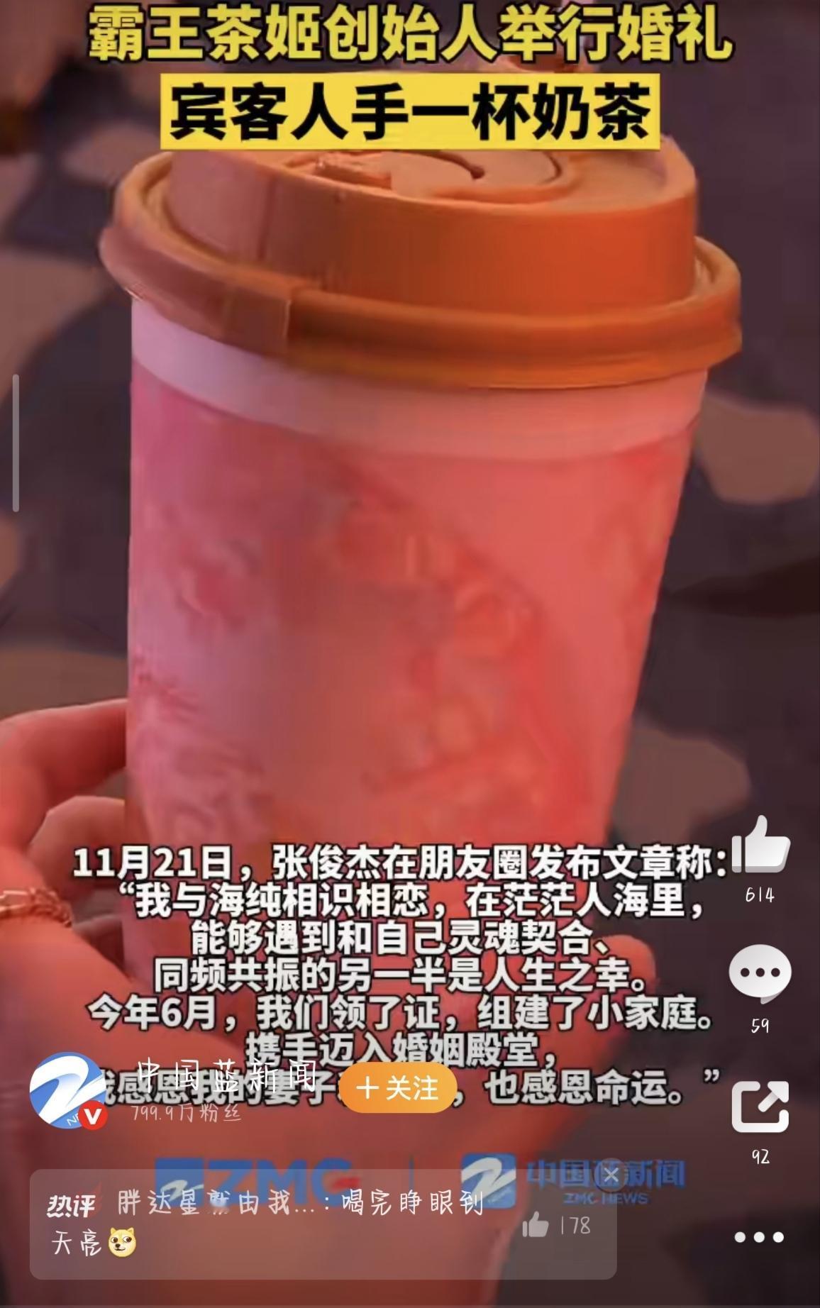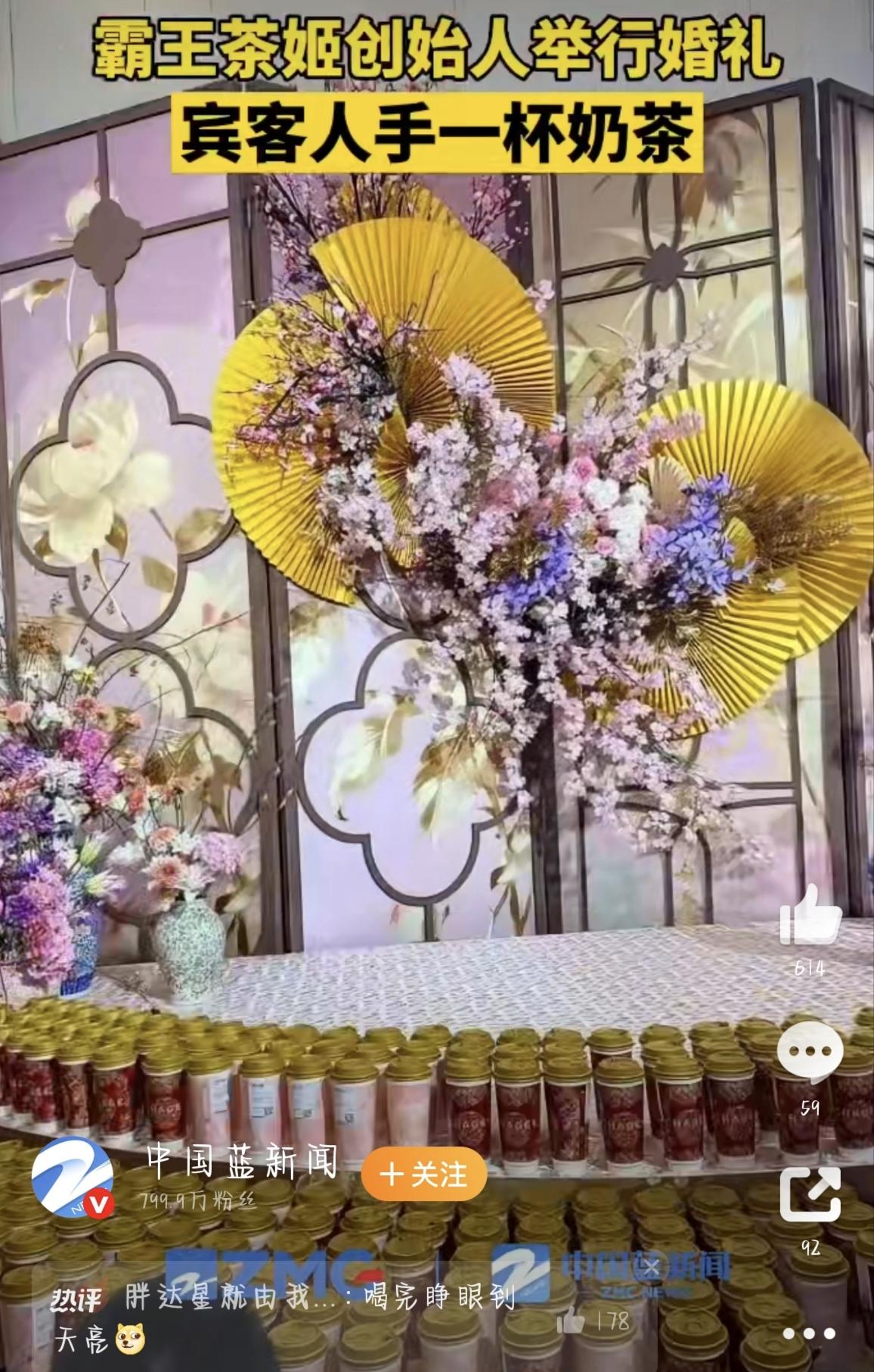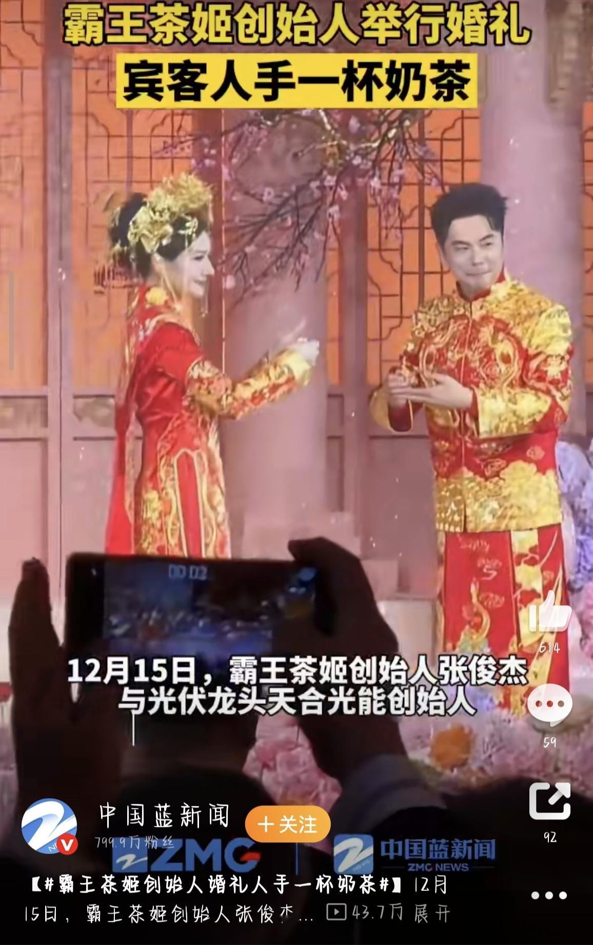 霸王茶姬创始人婚礼太会了!宾客人手一杯奶茶,千亿联姻甜翻全网。 12月15日,互联网被一场“奶茶味婚礼”刷了屏!霸王茶姬创始人张俊杰和光伏巨头天合光能的“千金”高海纯在常州办大婚,这场横跨新茶饮和新能源、两家市值加起来超600亿的强强联合,没靠奢华排场出圈,反倒因为“人手一杯自家奶茶”的细节,成了最接地气的热搜焦点。 从网友晒出的现场视频和照片来看,这场婚礼走的是典雅中式风,新人穿着凤冠霞帔,背景布景藏着凤凰、牡丹的吉祥元素,简约又不失仪式感。但最吸睛的绝对是随处可见的霸王茶姬——展台被一排排奶茶摆得满满当当,经典款“伯牙绝弦”赫然在列,粉色和红色的杯套上还印着“俊杰&海纯佳偶天成”的字样,喜庆又应景。不管是到场的嘉宾,还是现场工作人员,手里都捧着一杯奶茶,网友调侃:“别人婚礼敬酒,这场敬奶茶,喝完清醒又喜庆,就是茶多酚拉满,怕是要嗨到天亮!” 其实这场婚礼早在上个月就引发关注,11月请柬流传后,张俊杰很快在朋友圈证实了婚讯,还透露两人6月就已低调领证。更让人羡慕的是,这不是商业联姻,而是两位93年出生的青年企业家的双向奔赴——他们在青年企业家学习活动上相识,一个白手起家,一个学霸逆袭,妥妥的势均力敌。 新郎张俊杰的经历堪称励志天花板,10岁父母相继离世,17岁闯入奶茶行业摸爬滚打,8年时间就把霸王茶姬从地方小品牌做到全国7000多家门店,如今个人身家超百亿。新娘高海纯也毫不逊色,布朗大学学霸出身,进天合光能历练8年后,现在已是公司联席董事长,扛起了市值超400亿企业的转型大旗。 更圈粉的是张俊杰的暖心操作,不仅婚礼上用自己的品牌招待宾客,还给全国7000多家门店的员工都送了喜糖礼盒,里面装满棉花糖、巧克力和夹心饼干,员工们纷纷晒图打卡,直呼“沾到大老板的喜气”。 网友们一边羡慕这场“甜到齁”的婚姻,一边夸这波营销太巧妙。要知道现在年轻人办婚礼,都不爱传统酒桌文化了,“以茶代酒”既健康又有仪式感,而霸王茶姬的新中式风格刚好和中式婚礼适配度拉满。其实这早不是它第一次进军婚庆场景,之前国庆期间婚庆订单就暴涨300%,这次创始人直接用自己的婚礼做“活广告”,嘉宾发朋友圈分享时,无形中就给品牌做了免费宣传,比硬广管用多了。 一场千亿市值的联姻,没有铺张浪费,反而靠一杯奶茶传递出真诚和初心。既让大家沾了喜气,又让品牌深入人心,不得不说,张俊杰这波操作真的太会了!祝福这对新人的同时,不少网友已经开始期待:下次办喜事,能不能给消费者也来波奶茶福利呀? 来源:中国蓝新闻
