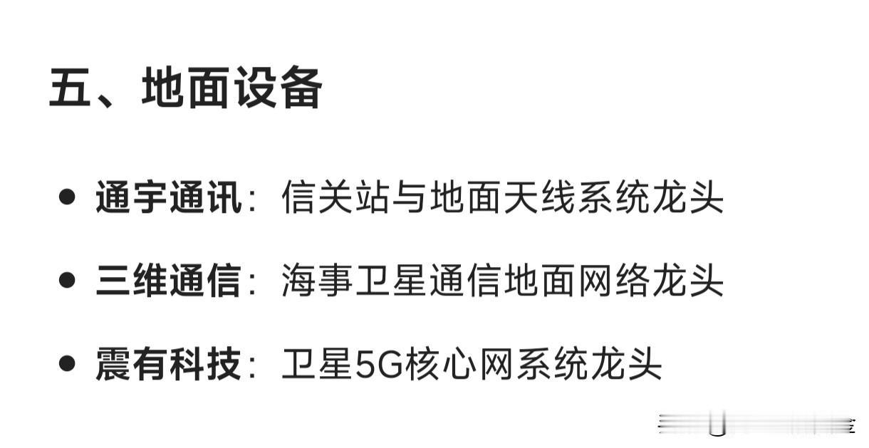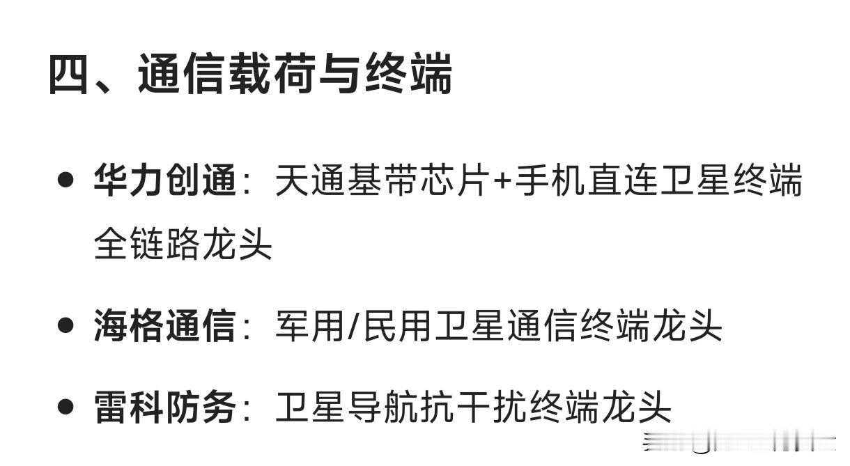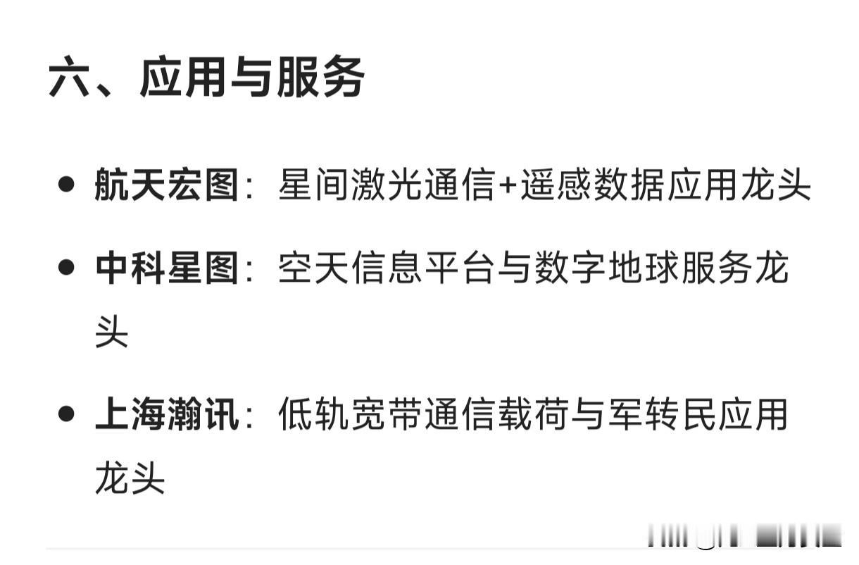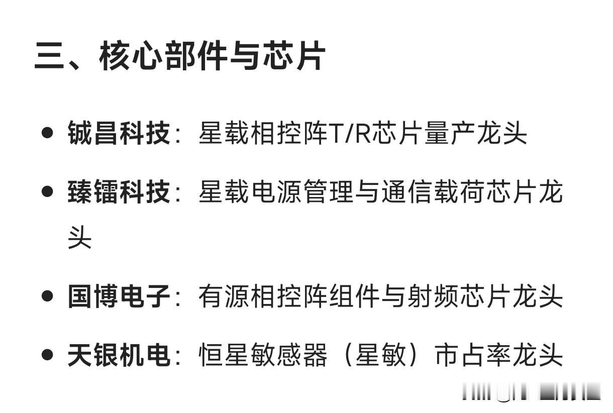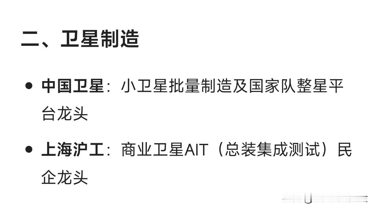 卫星互联网概念细分龙头企业汇总 一、总体运营与星座建设 中国星网(未上市):国家低轨卫星互联网星座总龙头 中国卫通:高轨+低轨卫星通信运营双牌照龙头 中国联通:手机直连卫星业务牌照与运营龙头 二、卫星制造 中国卫星:小卫星批量制造及国家队整星平台龙头 上海沪工:商业卫星AIT(总装集成测试)民企龙头 三、核心部件与芯片 铖昌科技:星载相控阵T/R芯片量产龙头 臻镭科技:星载电源管理与通信载荷芯片龙头 国博电子:有源相控阵组件与射频芯片龙头 天银机电:恒星敏感器(星敏)市占率龙头 四、通信载荷与终端 华力创通:天通基带芯片+手机直连卫星终端全链路龙头 海格通信:军用/民用卫星通信终端龙头 雷科防务:卫星导航抗干扰终端龙头 五、地面设备 通宇通讯:信关站与地面天线系统龙头 三维通信:海事卫星通信地面网络龙头 震有科技:卫星5G核心网系统龙头 六、应用与服务 航天宏图:星间激光通信+遥感数据应用龙头 中科星图:空天信息平台与数字地球服务龙头 上海瀚讯:低轨宽带通信载荷与军转民应用龙头