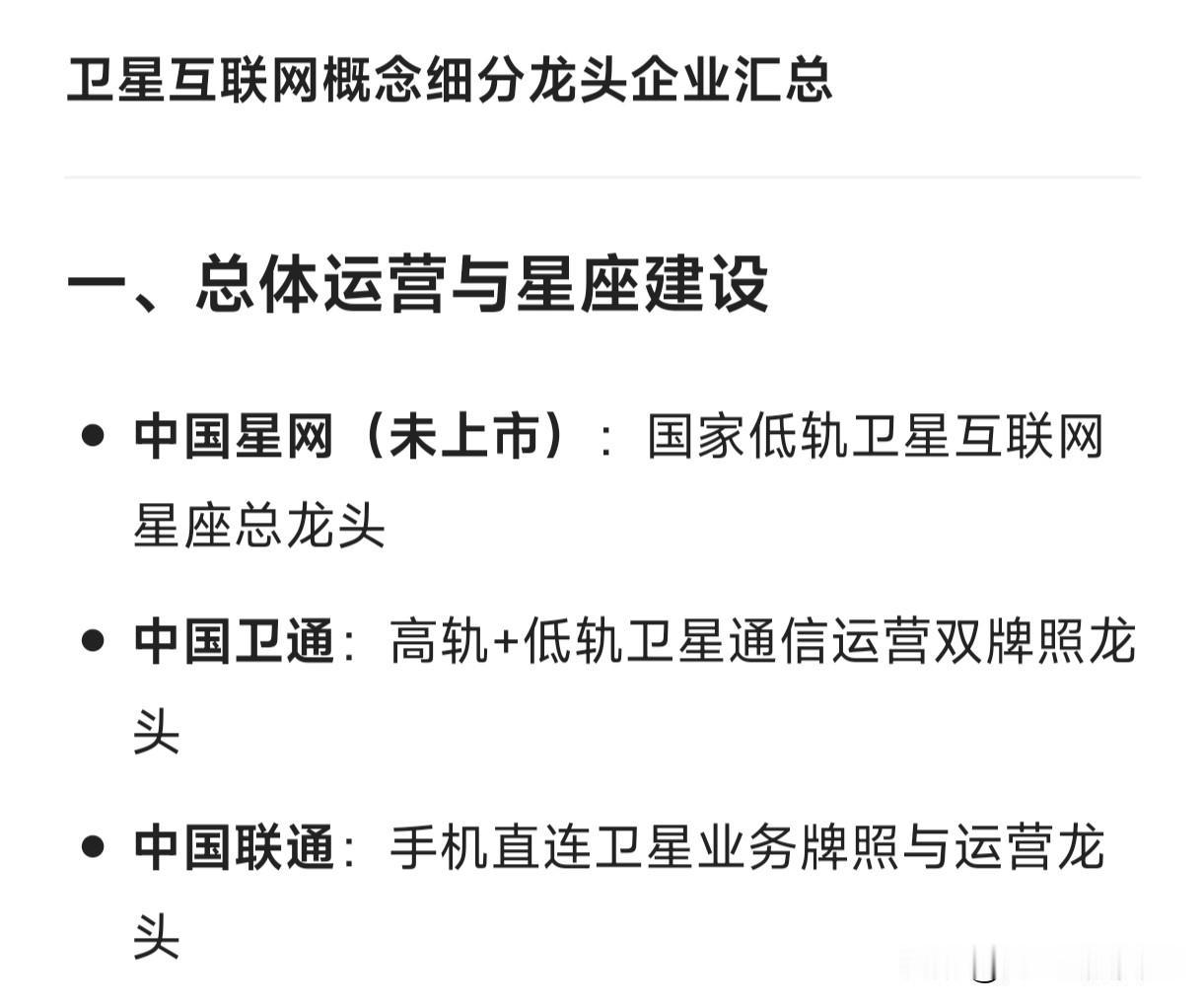 卫星互联网概念细分龙头企业汇总 一、总体运营与星座建设 中国星网(未上市):