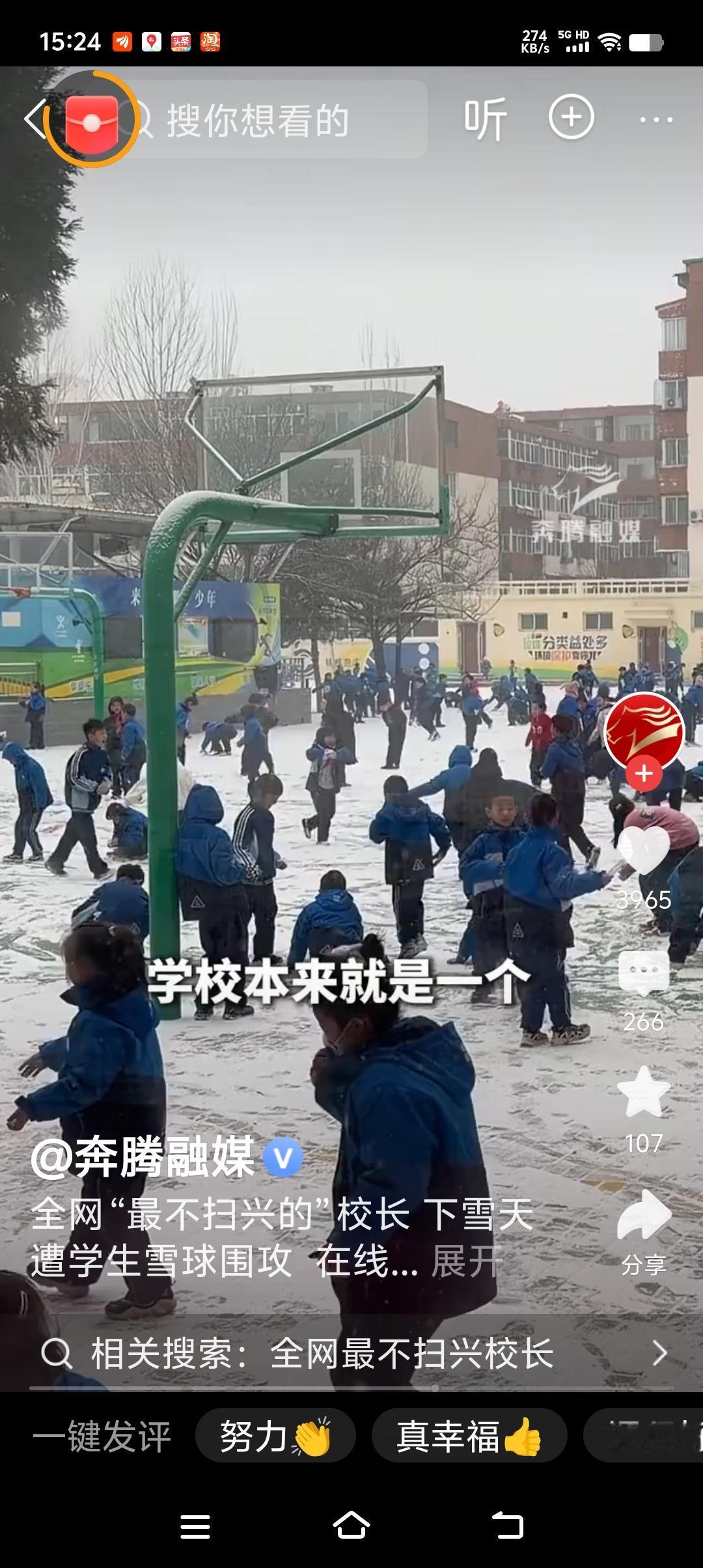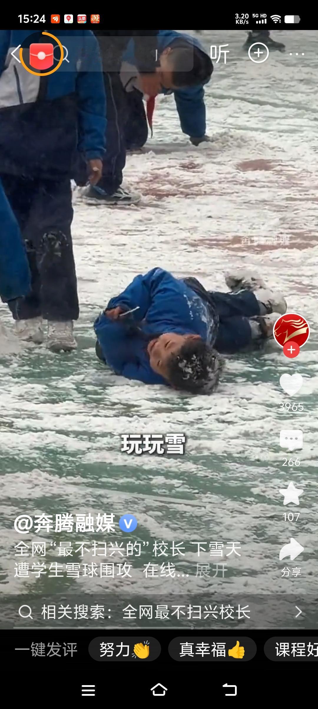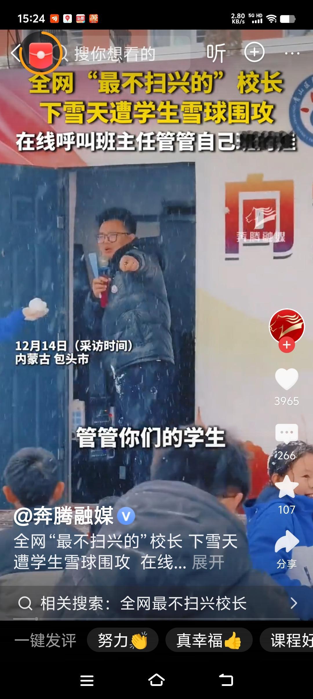 校长被打得在线呼救:“赶紧管管你班学生吧!” 这是咋回事,这学生也太“野蛮了!”,怎么把校长打成这样? 再仔细一看,我们说:“这校长真该打!越打我们看着越高兴!” 原来是校长下令,让学生们在雪中打雪仗, 你说孩子们这高兴劲一上来,谁管你是校长还是同学,一律“开炮”! 看到校长一首拿着麦克风,一边缩着脖子,躲避“炮弹”,“在大雪中喊叫赶紧管管你班学生!”真的太搞笑了! 这位校长真是 被打的不可奈何不喊哈好点,越喊越挨揍! 看着一名小男孩,在雪地里打滚,不免想起这活脱脱是我们小时候的模样! 在冰天雪地里滑冰车堆雪人,打雪仗在雪地里打滚, 在冰上玩钻被窝! 冰上钻“被窝”,就是从高处往低处滑,不是坐 着滑冰,也不是站着,滑冰,而是趴着滑,就像钻在被窝里一样, 那时候的孩子,哪有什么羽绒服啊?就是大棉袄二棉裤,有的时候回家里棉袄棉裤都冻得硬邦邦的, 玩累的够呛,还要挨爸爸妈妈一顿揍,因为棉袄棉裤弄湿的了,很不容易干,屋子又冷,只好在热炕头上烙! 这个学校组织的活动太好了,让我们看到了孩子真的回归了自然,真的头上有汗,眼里有光,这次是少年该有的样子! 相比之下前一段有位网友写了,下雪的时候校园静悄悄的学校,不让孩子走出教室担心滑倒了,可是这位负责的班主任却把孩子们偷偷的带到操场上玩雪了,为这位勇敢的班主任点赞! 希望其他学校的领导们看到视频的时候,是不是应该很好的学习一下,应该放下包袱,学生的安全,应该放在首位,但是也不能因噎废食,因为安全就束缚孩子手脚,扼杀孩子天性,把孩子困在水泥笼子,这是精致的自我保护主义, 美其名曰是为了孩子,其实这样是害了孩子!