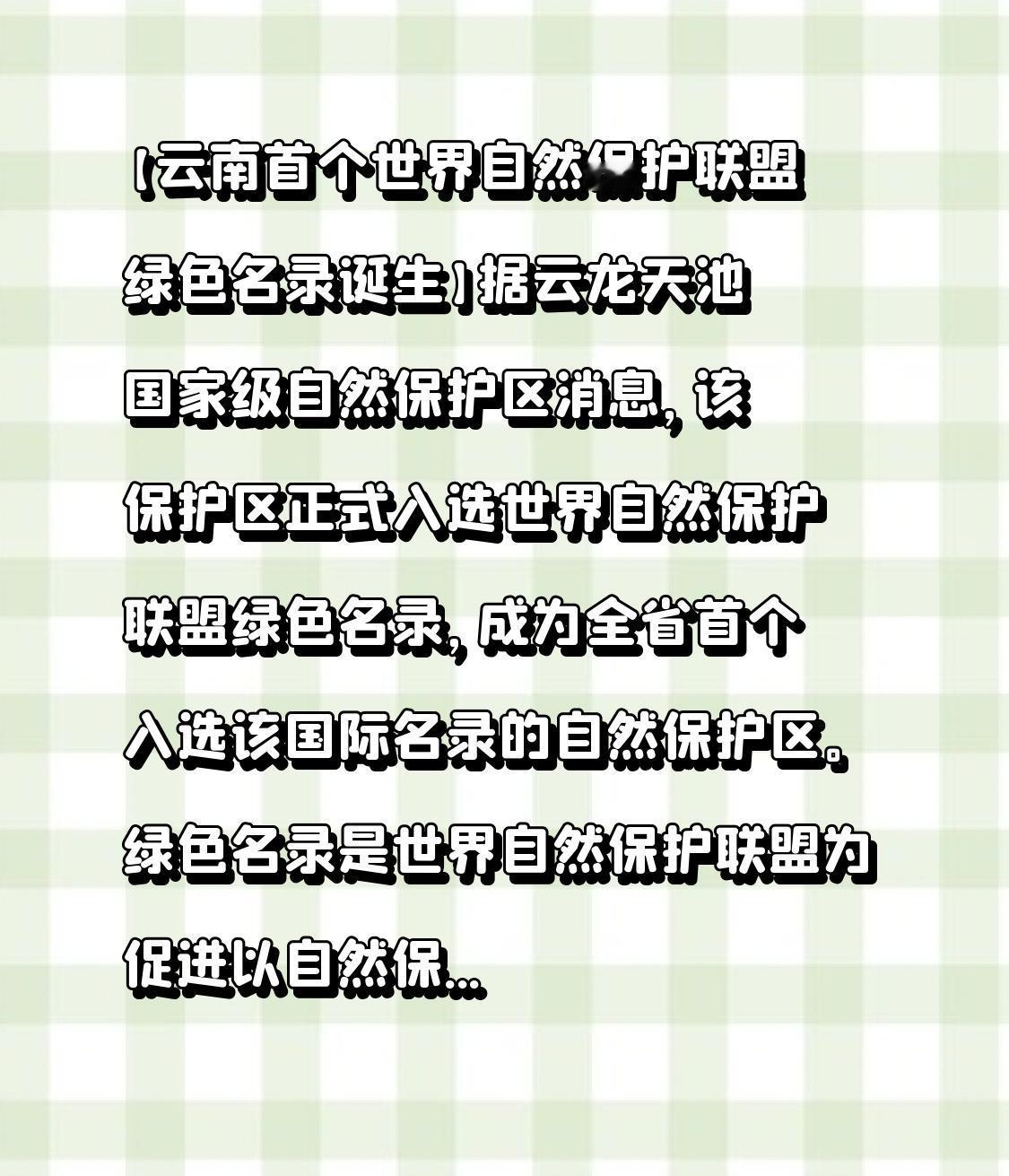 【云南首个世界自然保护联盟绿色名录诞生】 据云龙天池国家级自然保护区传来的消息,该保护区成功入选世界自然保护联盟绿色名录,成为云南省首个入选这一国际名录的自然保护区。 绿色名录是世界自然保护联盟为推动基于自然保护地的生物多样性保护而制定的全球计划,是衡量保护地管理状况的全球标准。截至目前,我国已有25个自然保护区入选。 此次云龙天池国家级自然保护区入选,不仅是对其生物多样性保护和生态治理成效的肯定,也为中国自然保护地在全球生态保护领域树立了新典范。
