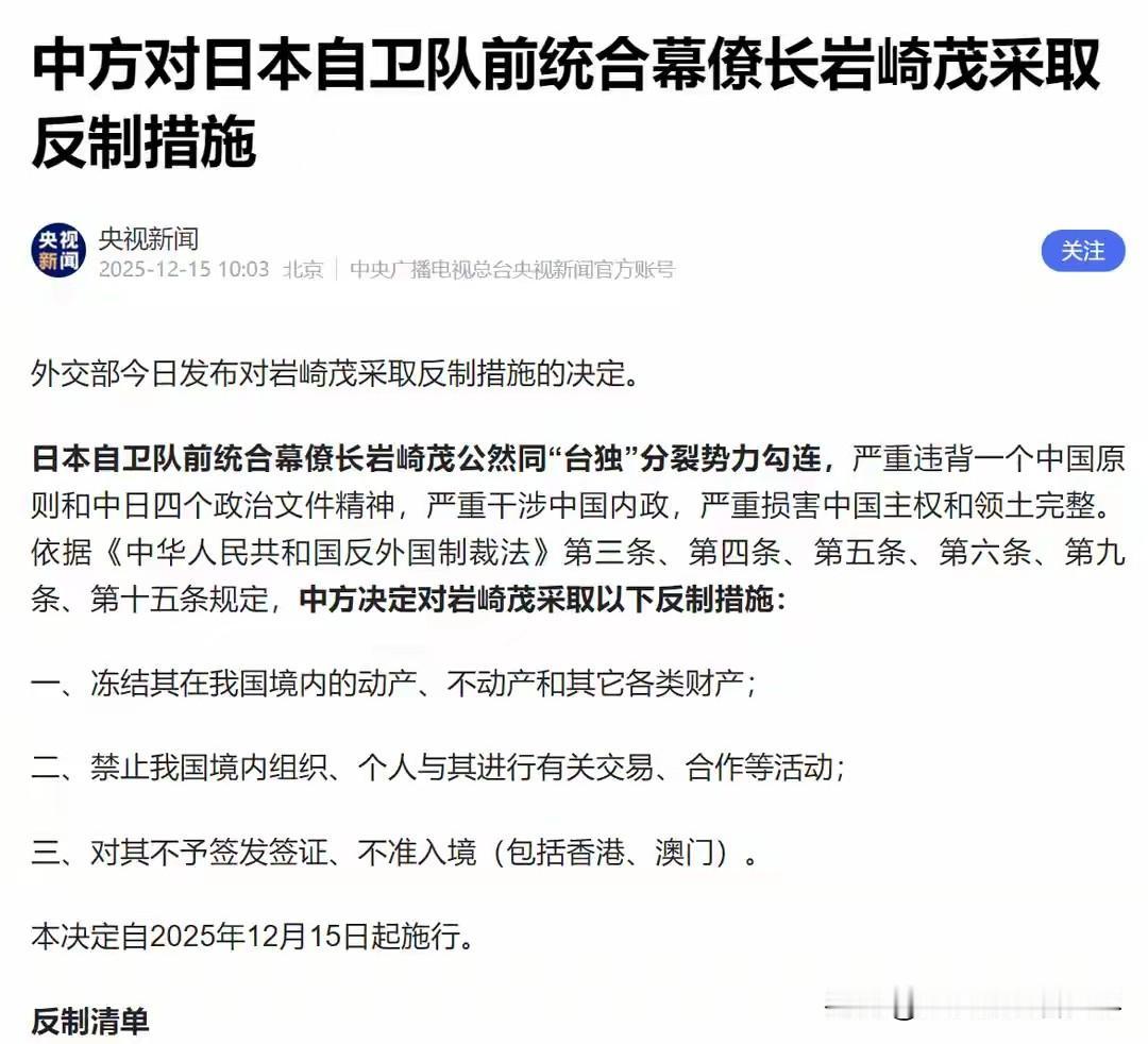 就在今日,我外交部果断出手,对日本自卫队前统合幕幕僚长岩崎茂进行制裁,冻给资产,不许入境,禁止境内个人或组织与其合作。 岩崎茂这厮,公然同“台独”势力勾连,严重违背一个中国原则和四个政治文件精神。退休之后接受台湾相关机构顾问任命,当起了“台独”分子的“幕后军师”,提供各种情报,干着反华勾当。他与民进党的勾连,绝非简单的利益输送,背后藏着的是日本妄图分裂中国的阴谋。 中方对岩崎茂的有力制裁,不仅是对他本人的严厉惩罚,更是对日本右翼反华分子发出严重警告,日本右翼应该警醒,不要再抱有“倚外谋独”的幻想,不要再做硬碰中国红线、突破中国底线的蠢事。否则,不管是什么人物,都会被列入下一个制裁清单!