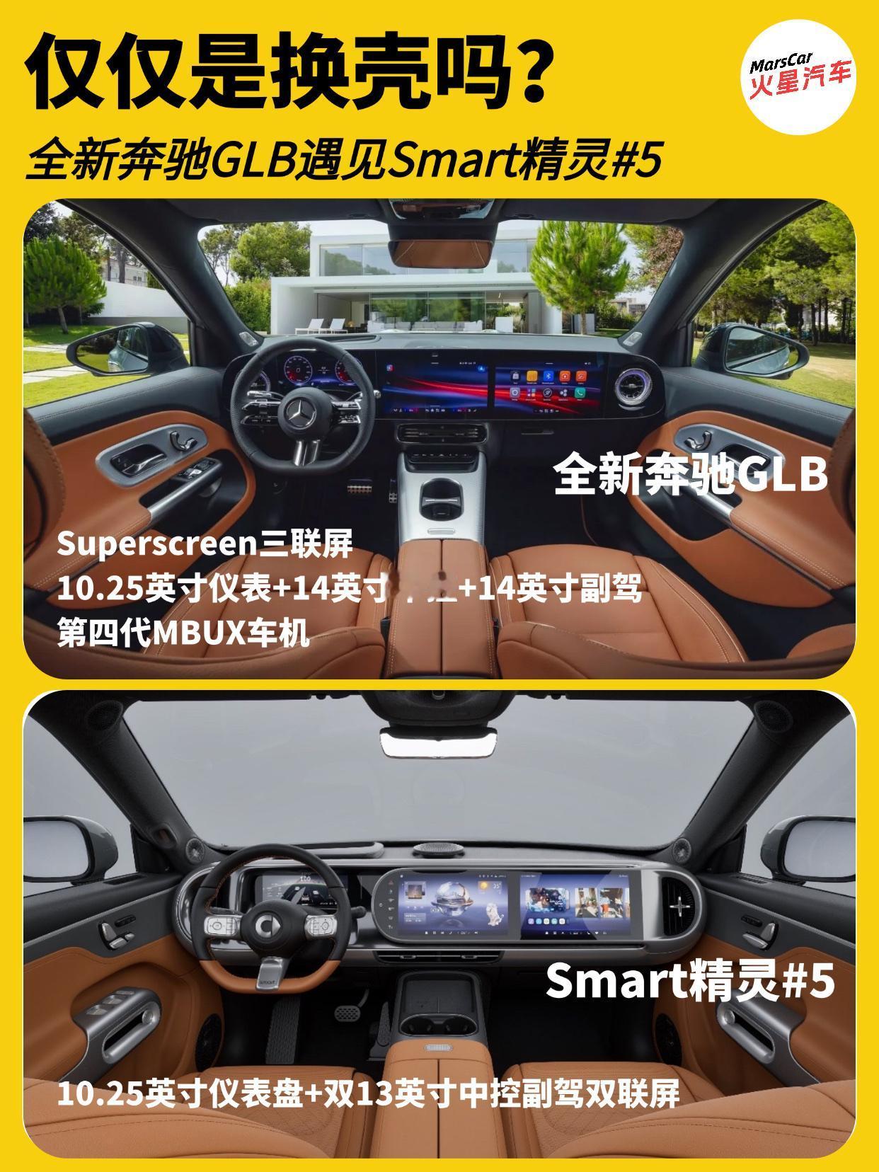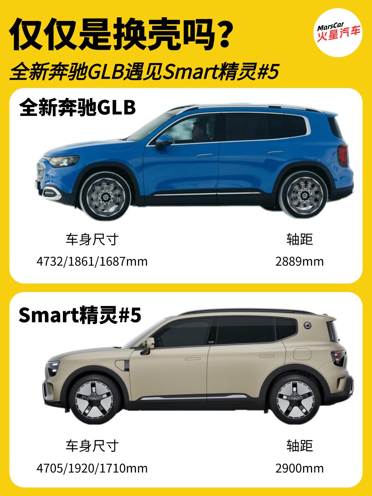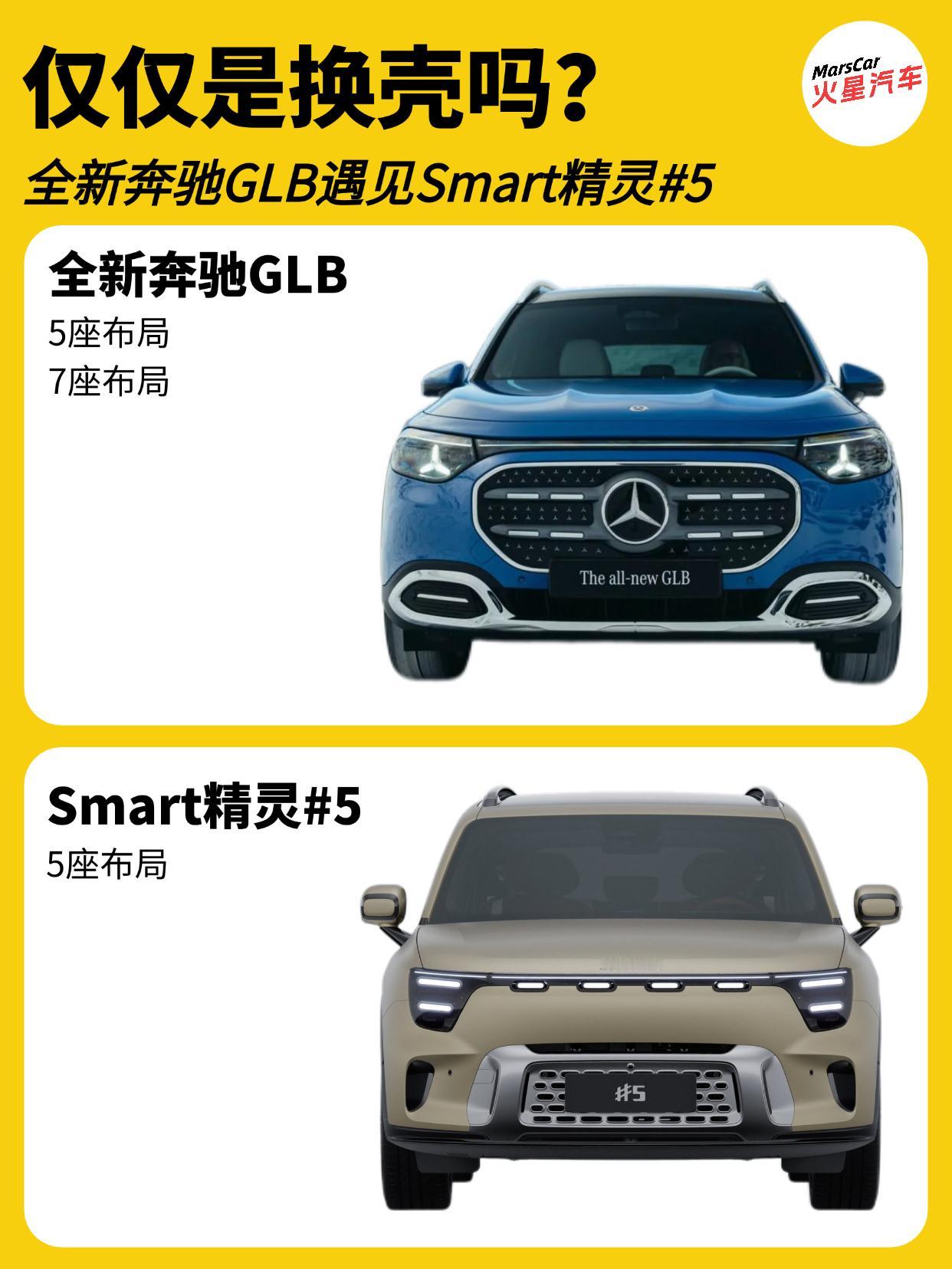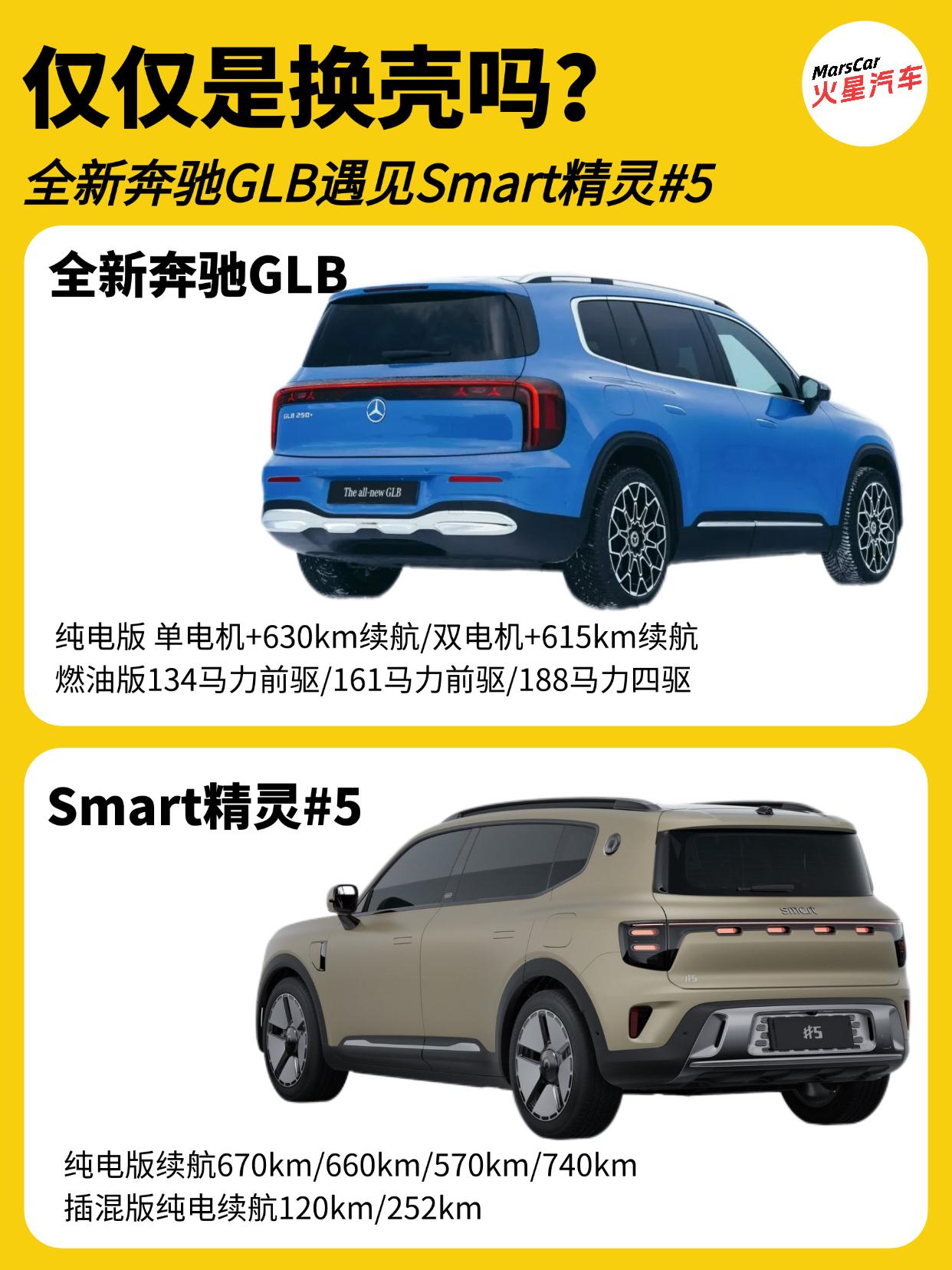 真的是换壳?全新奔驰GLB和Smart精灵5差别有多大?   全新奔驰GLB首发以来,很多人都说它和Smart精灵5是兄弟换壳车型,但事实上真是换壳车型吗?今天我们来聊聊这两款车!   把这两款车放在一起,整体轮毂非常相似,要说是亲兄弟一点都不为过,这其实是奔驰核心设计语言的共享,尤其是侧面,车顶线条,D柱和直立的车尾简直就是如出一辙。 前脸是两款车区别最大的地方,毕竟这可是凸显品牌的地方。车尾虽然有着明显的不同,但贯穿式尾灯依然是相同的设计思路。   再看内饰,两款车型的内饰虽然在细节上的设计不尽相同,但三款大屏的搭配依然是相同的味道,全新GLB采用由10.25英寸全液晶仪表屏、14英寸中控屏和14英寸副驾娱乐屏组成贯穿式三联屏,Smart精灵5采用10.25英寸仪表盘+双13英寸中控副驾双联屏。   在尺寸方面,全新GLB的长宽高为4732/1861/1687mm,轴距2889mm,提供5座和7座布局。Smart精灵5的长宽高为4705/1920/1710mm,轴距为2900mm。只提供5座版本。   虽然全新GLB和Smart精灵5的设计相似度很高,但这两款的技术却完全不同,全新GLB是基于奔驰最新的MMA平台开发而来。而Smart精灵5则是基于吉利SEA平台打造。   在动力层面,全新GLB提供纯电和燃油两种动力,纯电版基于800V架构搭载,搭载85千瓦时电池组,提供后置单电机,纯电续航631km的GLB 250+版本,以及前后双电机,纯电续航615km的GLB 350 4MATIC版本。燃油版本将搭载全新1.5T四缸发动机+48V轻混系统,提供134马力和161马力两个前驱版本,以及188马力的四驱版。   Smart精灵5的纯电版提供670km,660km,570km,740km四种续航版本;插混版则提供120km和252km两种纯电续航可选。   那么这两款车该怎么选呢?要品牌,要三排七座,要燃油就选全新GLB;想要时尚个性,要插混动力,对7座无感,那就Smart精灵5。奔驰GLB
