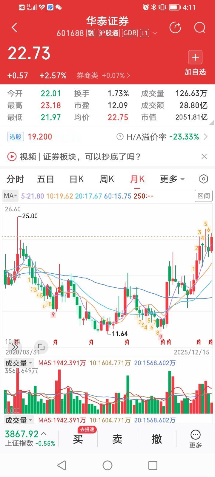 什么情况?今天券商股出现了些许的新气象!涨幅排行榜第一名的竟然是头部券商股华泰证券,这种情况似乎并不多见! 华泰证券今天低开高走,最高冲到23.18元,离历史高点23.50元只差0.32元,收盘上涨2.57%,收盘价22.73元。 从月K线形态来看,目前只有华泰证券的这波调整没有大幅回落,而是以平台高位强势整理完成的。 截止今天收盘,华泰证券今年涨幅为33.2%,涨幅居头部券商股第二名,涨幅不算小,但动态市盈率12.09倍,估值并不高。 华泰证券会率先发力上攻,再创今年股价历史新高吗?