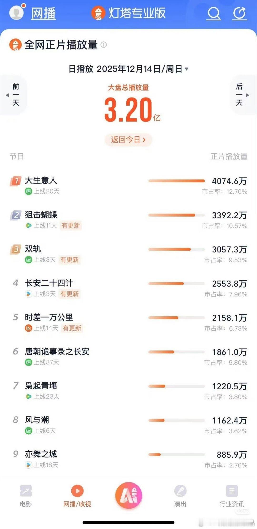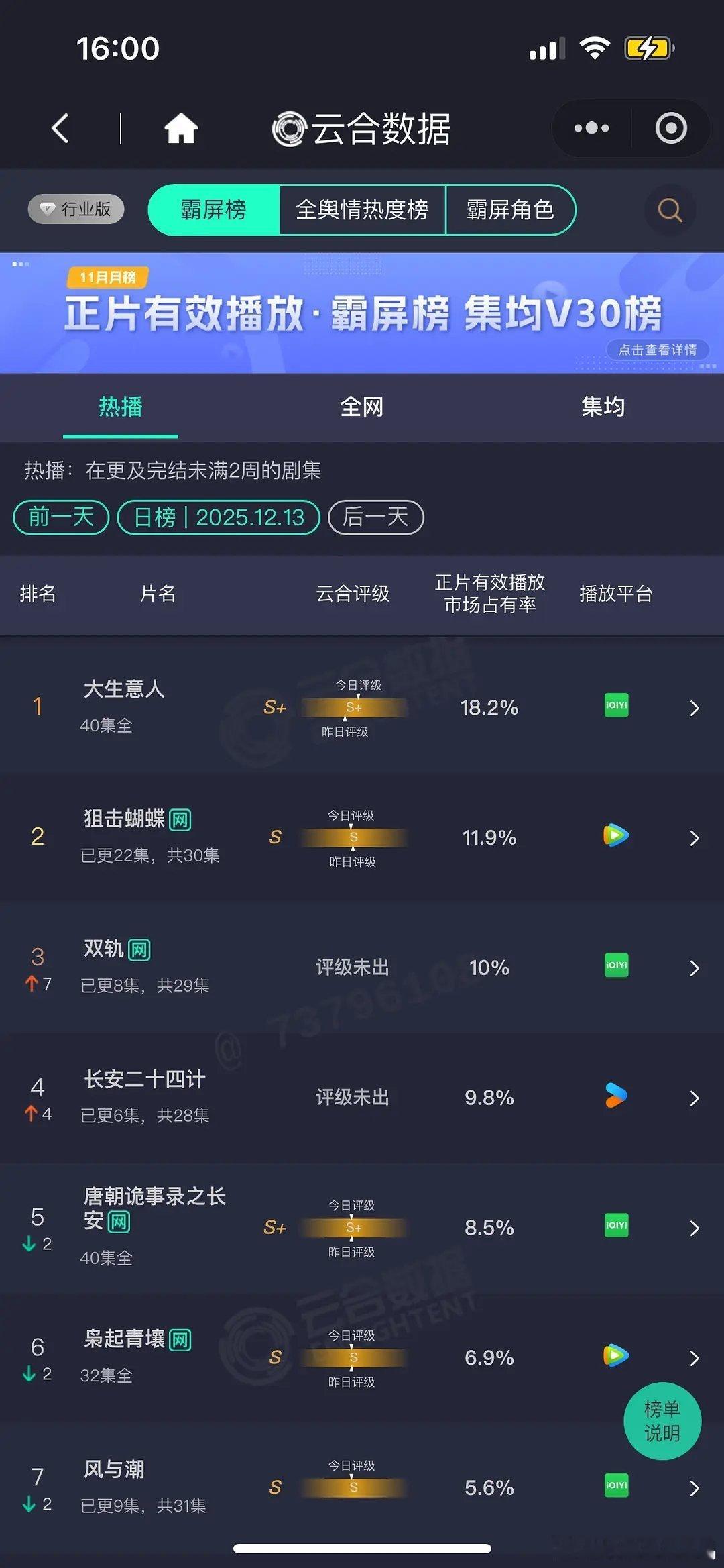 12.14 云合 大生意人16.8% 狙击玫瑰13.3% 二十四计10.6% 双轨10.5%。昨天灯塔数据,双轨比24计高。前天云合,双轨比24计高0.2%。 长安二十四计云合反超双轨 昨天的热搜词条是双轨云合超长安二十四计
