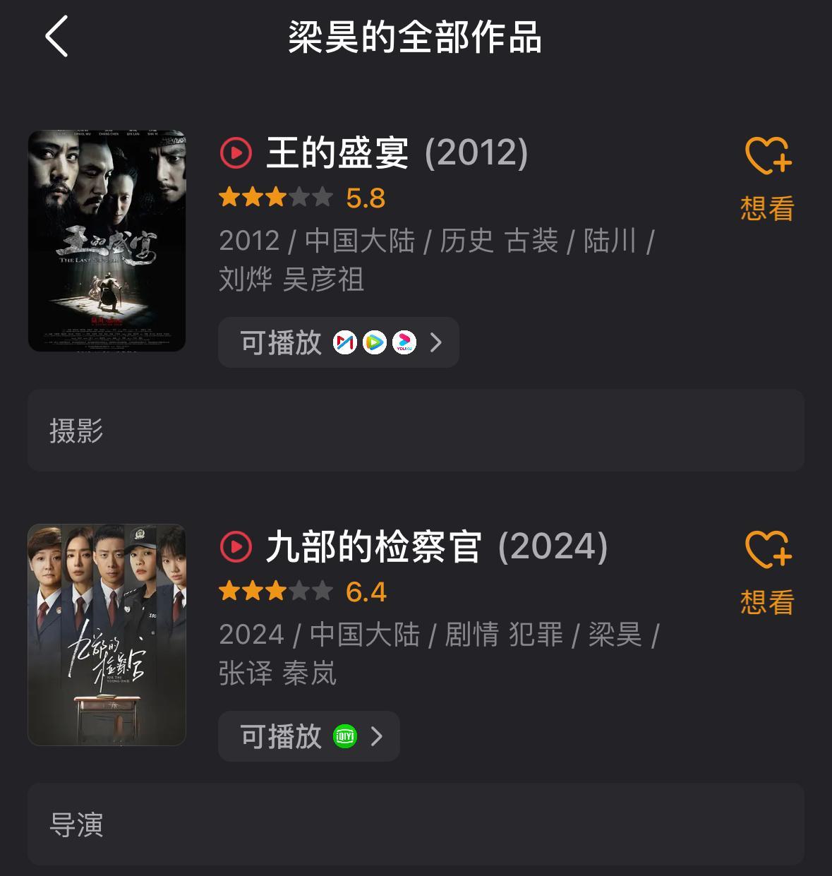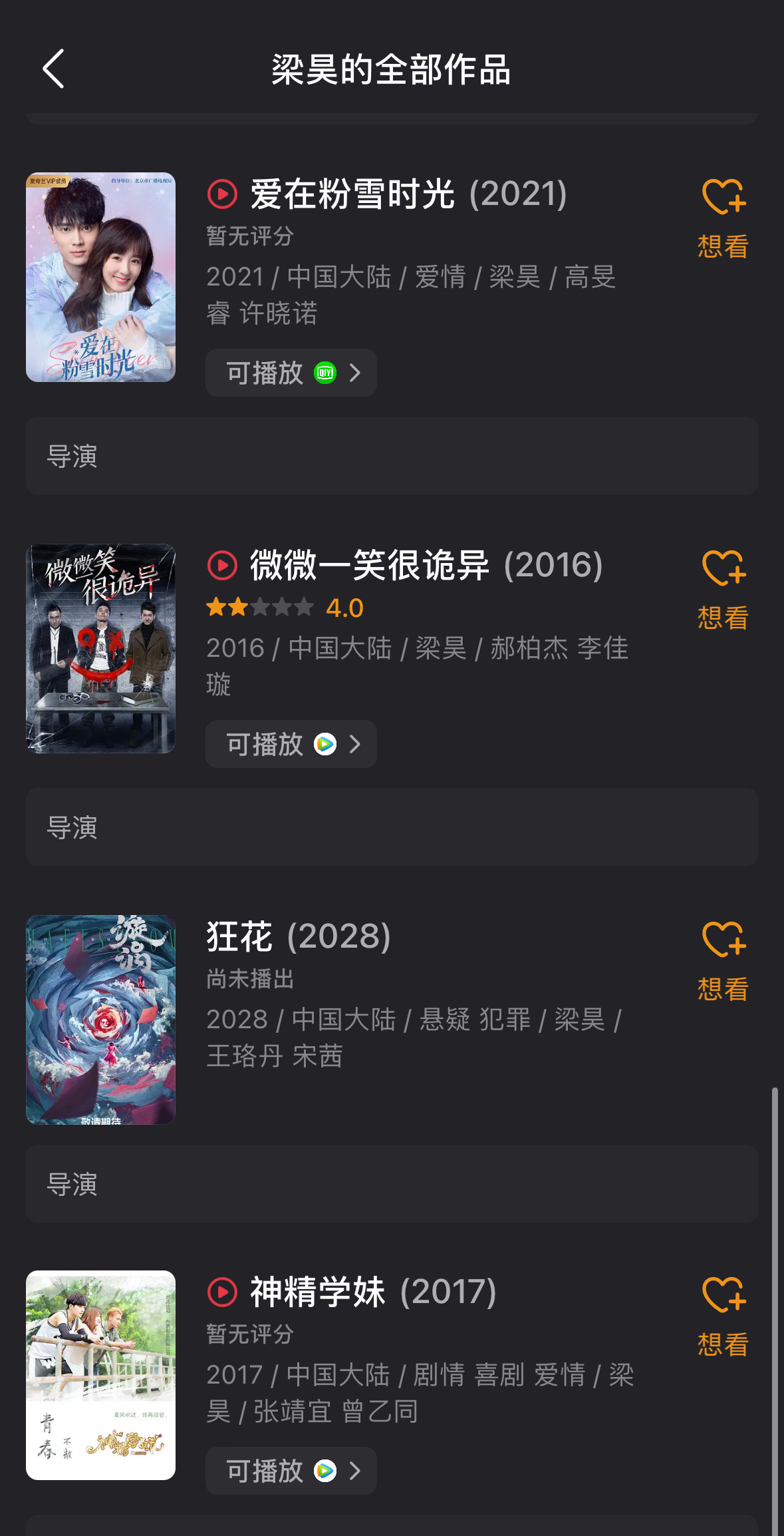 今天刚官宣了一部电视剧叫狂花我看了一下这导演梁昊往期作品都一般啊评分忽高忽低的,这部剧感觉又是豆瓣5、6分的水平..阵容里有宋茜、王珞丹还有王子文这几位好的女性演员,希望这导演给点力吧…别耽误这几位好演员。