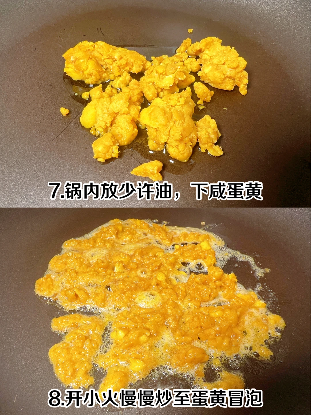 家常快手菜 蛋黄焗虾仁 咸香酥脆的蛋黄焗虾仁,😋好吃到直舔手指[赞R][赞R][赞R] [派对R]步骤: 1、虾仁去虾线后清洗干净 2、加料酒、盐、白胡椒粉 3、淀粉拌匀腌制十分钟 4、锅内放油,油热后虾仁下锅 5、炸至两面金黄捞出备用 6、准备两个咸蛋黄,用勺压碎 7、锅内放少许油,下咸蛋黄 8、开小火慢慢炒至蛋黄冒泡 9、下炸好的虾仁,翻炒均匀 10、最后撒上葱花就可以出锅啦[得意R]