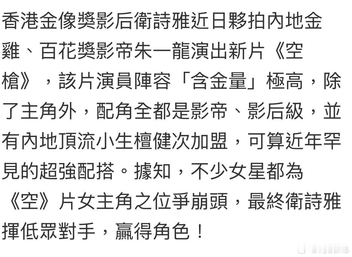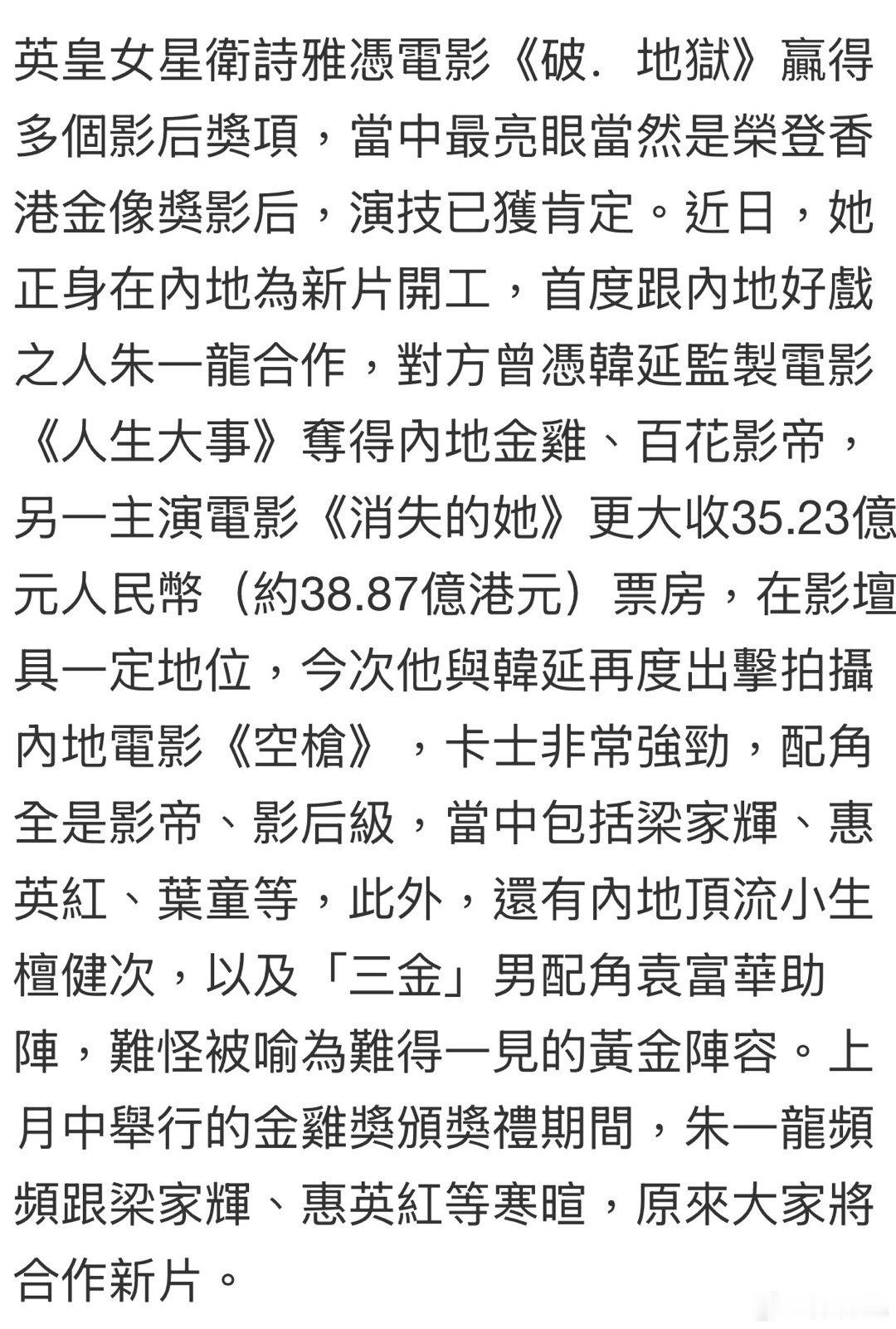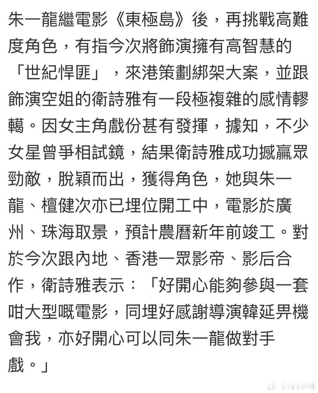 还是港媒会写标题:朱一龍做世紀悍匪 衛詩雅跑出陪談情香港金像奖影后卫诗雅近日与金鸡、百花奖影帝朱一龙演出新片《空枪》,该片演员阵容“含金量”极高,除了主角外,配角全都是影帝、影后级,并有影顶流小生檀健次加盟,可算近年罕见的超强配搭。朱一龙继电影《东极岛》后,再挑战高难度角色,有指这次将拥有高智慧的“世纪悍匪”,来港策划绑架大案,并与空姐的卫诗雅有一段极复杂的感情。因女主角戏份甚有发挥,据知,不少女星曾争相试镜,结果卫诗雅成功撼胜众劲敌,脱颖而出,获得角色,她与朱一龙、檀健次亦已就位开工中,电影在广州、珠海取景,预计广州新年前竣工。对于这次跟随香港一众影帝、影后合作,卫诗雅表示:“非常开心能够参与一部如此大型的电影,非常感谢导演韩延给我机会,亦非常开心能和朱一龙做对手戏。”