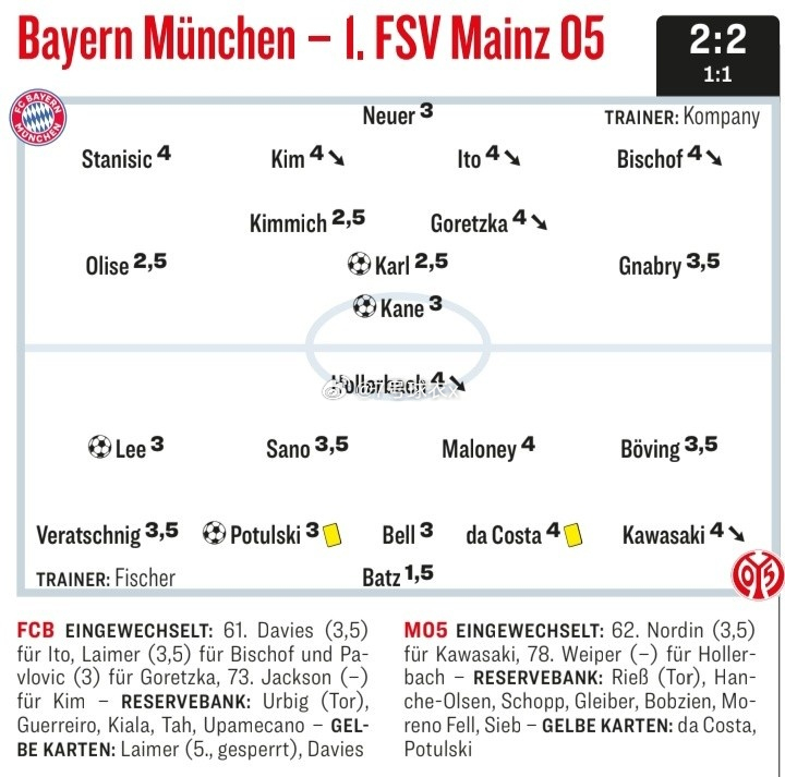 德甲第14轮比赛,拜仁主场2-2战平美因茨,德国媒体《踢球者》对两队球员进行了评