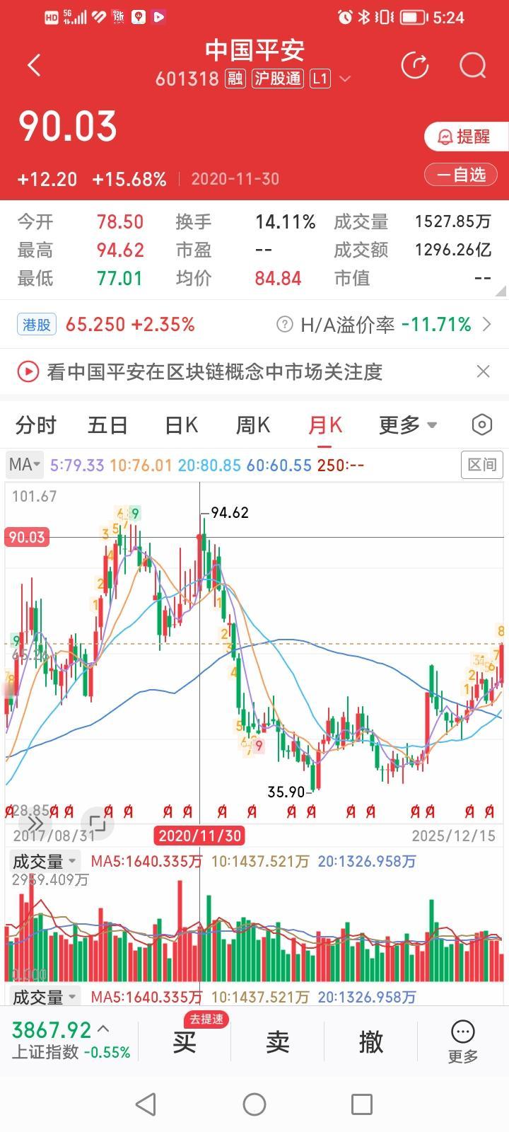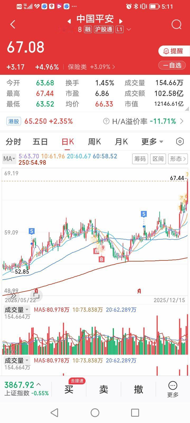 完犊子了!高抛低吸真害人,中国平安似乎开启了主升浪,但咱平安的仓位反而从第一大重仓股变成了第二大重仓股。 中国平安今天收盘大涨4.96%,收盘价67.08元。股价创出了近5年的新高。 在中国平安构筑55元整理平台时,咱有点耐不住寂寞,用小仓位做了几次高抛低吸,准备等它跌破58元再加点仓居然没等到。 中国平安的这波年末攻势会冲破70元整数关口吗?
