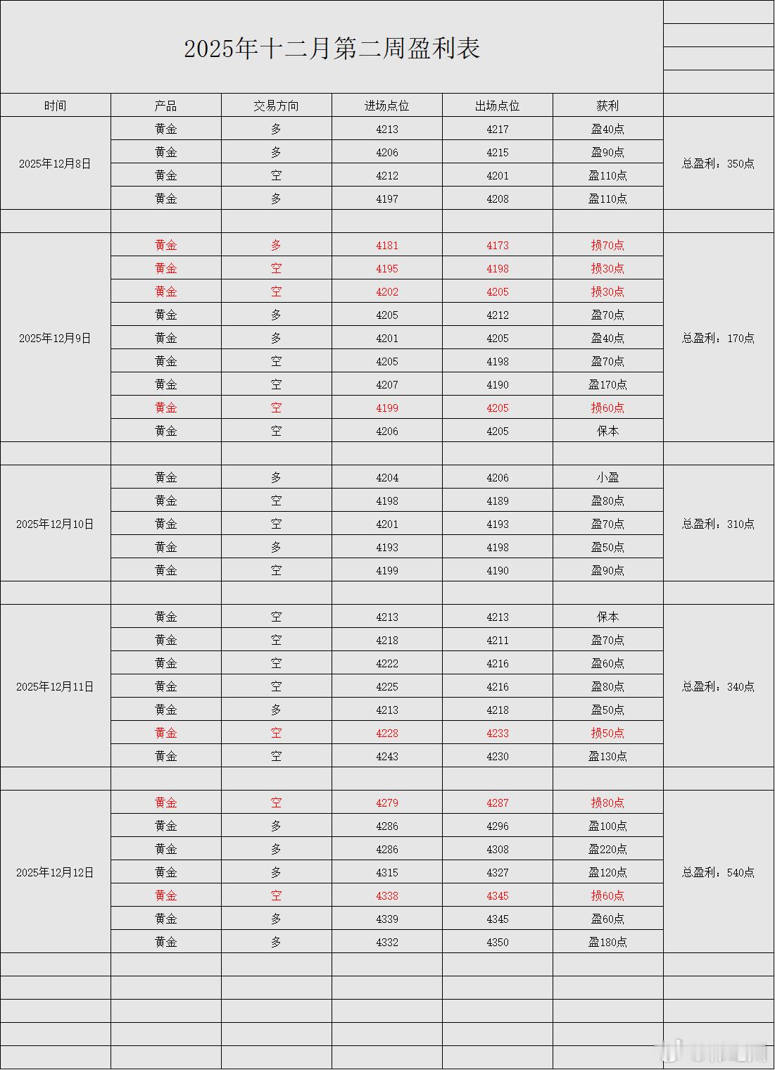 【上周五战绩回顾:日内五盈二损,净利共收割540点】第一单:黄金布局4279一线空单,抵达4287位置系统扫损80点;第二单:黄金布局4286一线多单,抵达4296位置附近止盈100点;第三单:黄金布局4286一线多单,抵达4308位置附近止盈220点;第四单:黄金布局4315一线多单,抵达4327位置附近止盈120点;网页链接 网页链接 网页链接 网页链接 网页链接 网页链接 网页链接 第五单:黄金布局4338一线空单,抵达4345位置系统扫损60点;网页链接 网页链接 第五单:黄金布局4339一线多单,抵达4345位置附近止盈60点;第七单:黄金布局4332一线多单,抵达4350位置附近止盈180点;网页链接 网页链接 网页链接 网页链接 网页链接 【上周五具体操作过程且点击上方微博链接查看即可】 周一战绩回顾:网页链接 周二战绩回顾:网页链接 周三战绩回顾:网页链接 周四战绩回顾:网页链接 与其担心市场将如何波动,其实各位更应该深思自己将如何策略性地应对这些变化!在当自己无法预测市场这波巨大浪潮时,就更无需为无法掌控的局势去消耗自身过多精力与情感,事实上,对错之分并非关键!真正意义上的焦点在于:当你决策正确时,你眼光能看多远,累积多少收益;而当决策失误时,你又能如何及时做到判决,减到损失,甚至打破困局?在老韩这里,损失在收获面前只会是微乎其微,也只有这样,才能在市场的风云变幻当中站稳脚跟,带领大家稳步前行!黄金金价