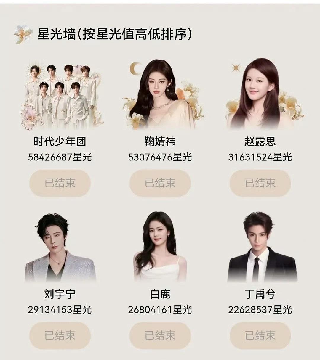 星光大赏星光墙截止TOP6:时代少年团鞠婧祎赵露思刘宇宁白鹿丁禹兮