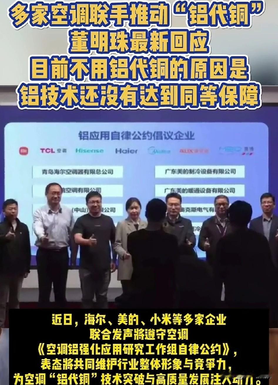 这事得警惕 多家空调企业联合签署所谓的自律公约,就是在用铝代替铜这件事上,谁也不能向对方发动恶意攻击。 在市场上能叫的上名字来的很多企业都参与了,作为空调的龙头企业格力,并没有参与其中。 董明珠在采访时直接表明,目前的铝代替铜,还没有达到相同的技术条件和保障,因此格力坚决不允许。 看来在做空调这件事上,董明珠还是比较专业的。