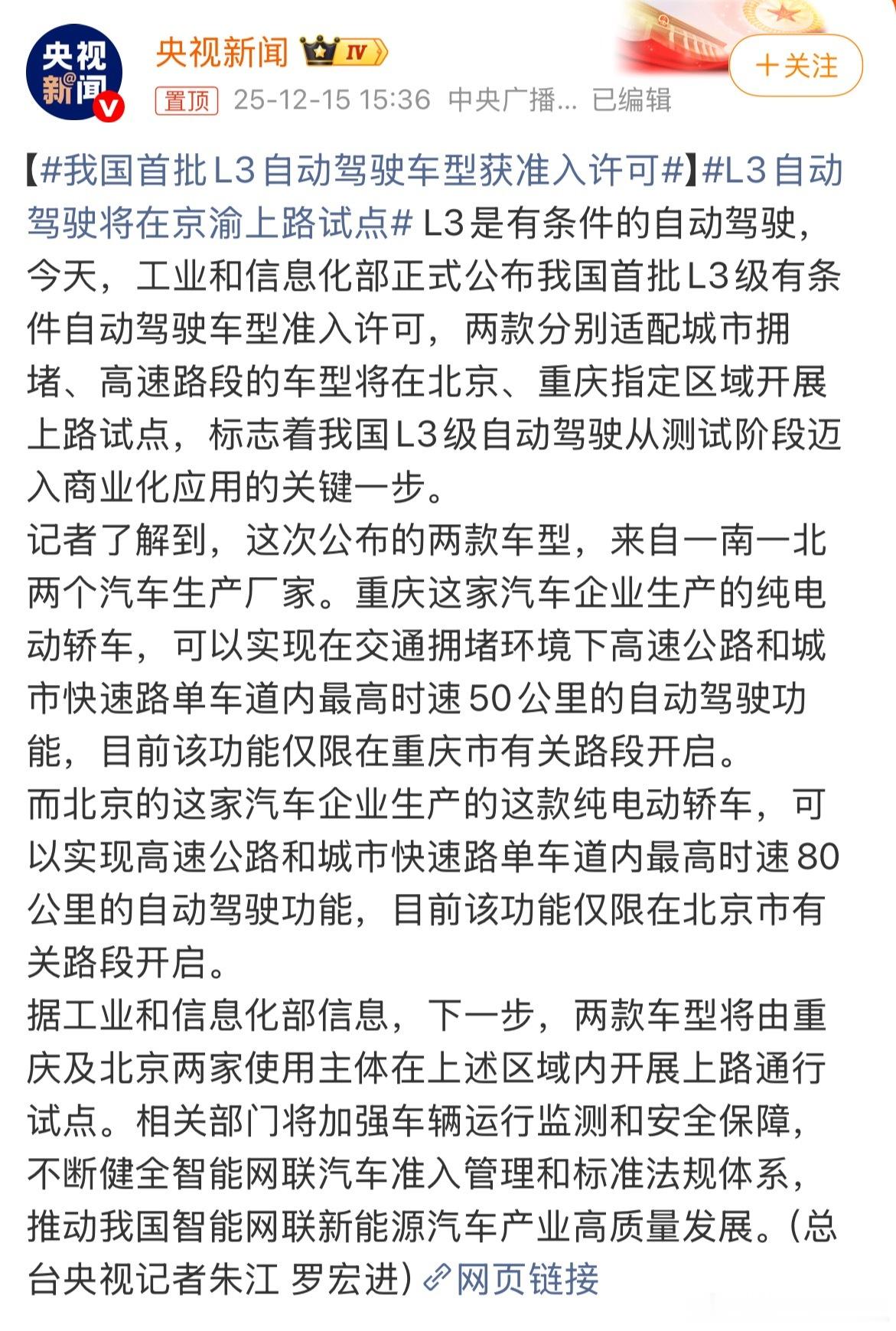 我国首批L3自动驾驶车型获准入许可行业里程碑!工信部正式批准L3级自动驾驶车型上