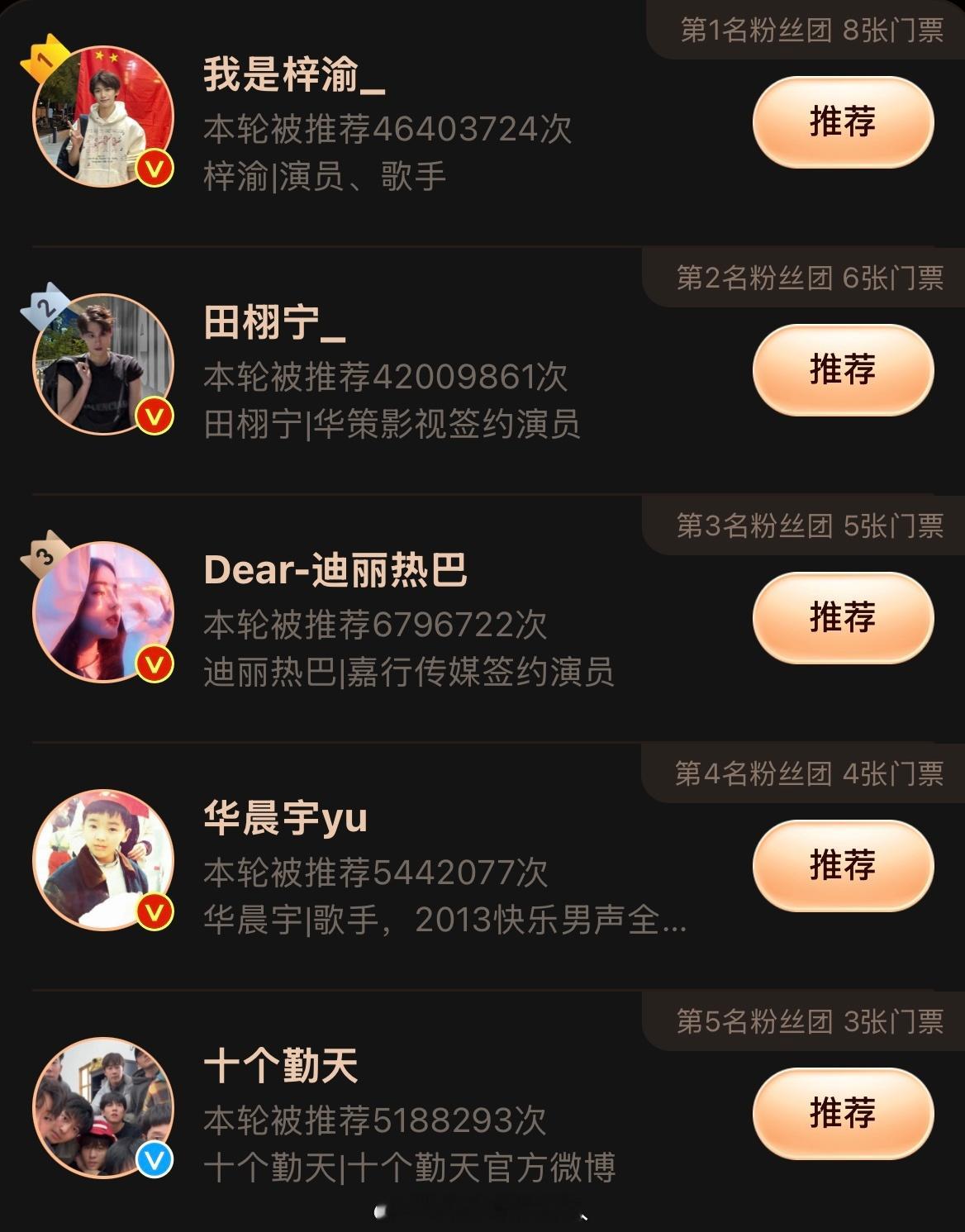 微博之夜投票微博年度星光人物前五名:梓渝、田栩宁、迪丽热巴、华晨宇、十个勤天