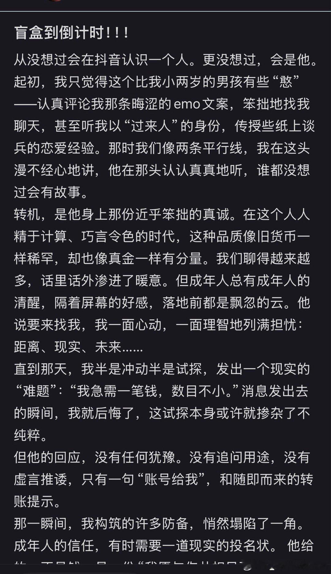 骗网恋对象说自己急需钱让对方打钱确定对方是不是“真心”,一百八十斤骗对方自己一百二十斤一个满嘴谎言的人是怎么有脸说“信任”和“亲密关系”的,这边建议把网恋对象咸鱼出掉别害人家了