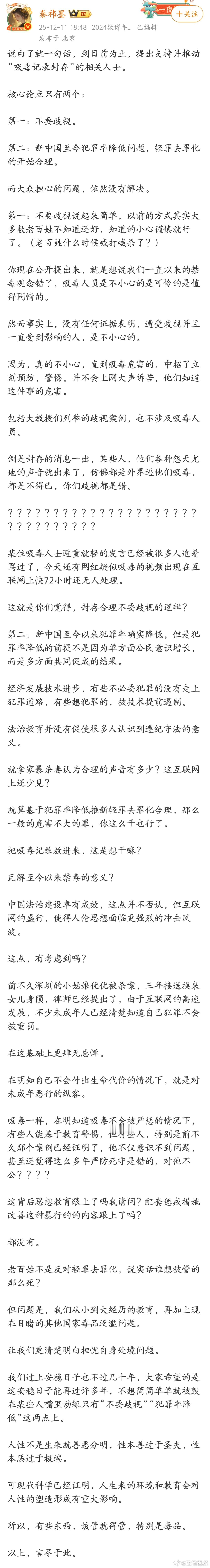 我们过上安稳日子也不过几十年,大家希望的是这安稳日子能再过许多年,不想简简单单就被毁在某些人嘴里动辄只有“不要歧视”“犯罪率降低”这两点上。有些东西,该管就得管,特别是毒品。
