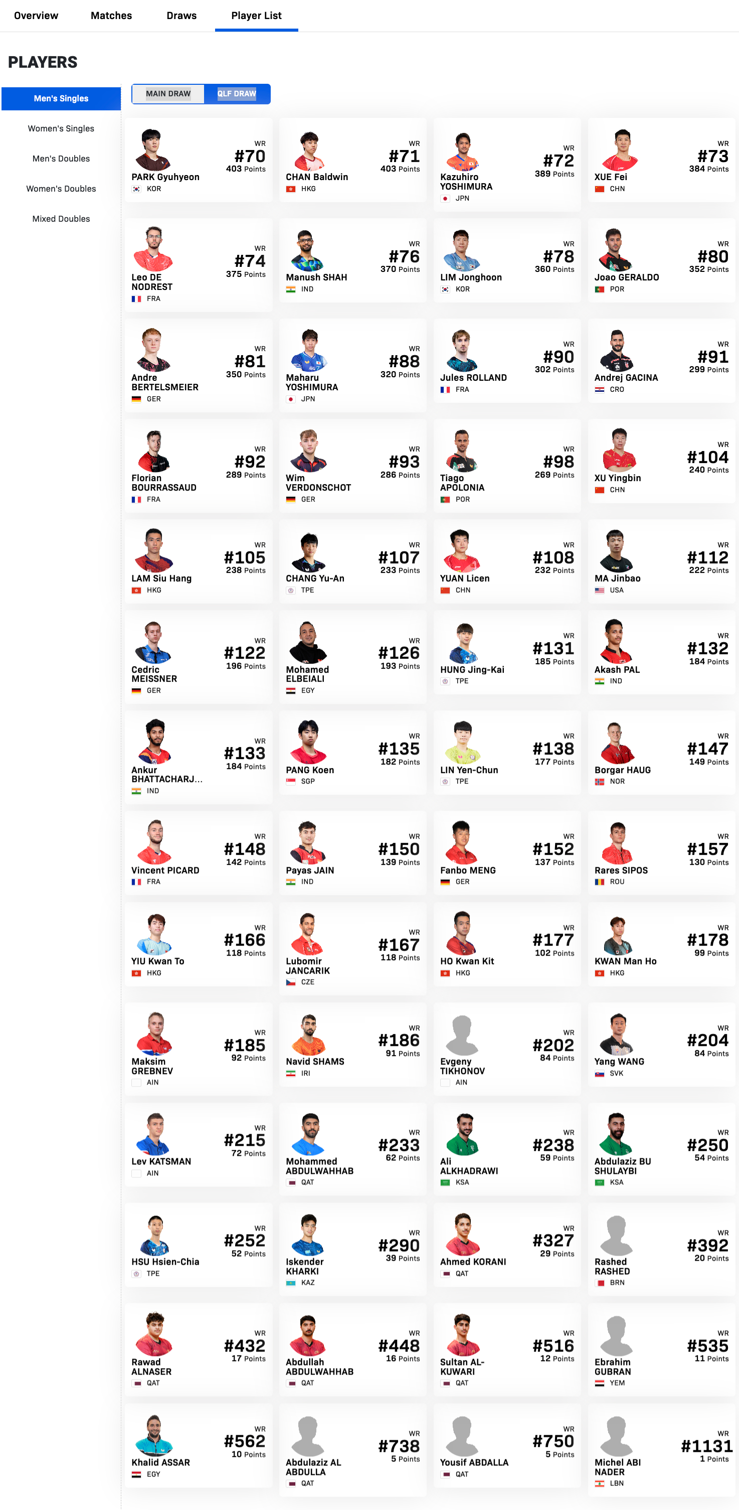 WTT球星挑战赛多哈站1.13-1.18丨男单外协参赛名单【正赛】张本智和🇯🇵、林昀儒(中国台北)、安宰贤🇰🇷、张禹珍🇰🇷、户上隼辅🇯🇵、吴晙诚🇰🇷、托米斯拉夫·普卡🇭🇷、夸德里·阿鲁纳🇳🇬、篠塚大登🇯🇵、迪米特里·奥恰洛夫🇩🇪、奥玛·阿萨尔🇪🇬、弗拉维安·科顿🇫🇷、迪博·泊雷特🇫🇷、曼纳弗·维卡诗·塔卡🇮🇳、米洛什·雷德齐姆斯基🇵🇱、克里斯蒂安·卡尔森🇸🇪、黄镇廷🇭🇰、力廉·巴德🇫🇷、约瑟夫·阿卜杜勒·阿齐兹🇪🇬、赵大成🇰🇷、沙提安·加纳纳塞卡兰🇮🇳、瓦拉迪米尔·希德仁科(AIN)、朴康贤🇰🇷、阿尔瓦罗·罗伯勒斯🇪🇸、吉山僚一🇯🇵、郭冠宏(中国台北)【资格赛】朴奎炫🇰🇷、陈颢桦🇭🇰、吉村和弘🇯🇵、利奥·德·诺德雷斯特🇫🇷、玛纳什·沙🇮🇳、林钟勋🇰🇷、若奥·格拉尔多🇵🇹、安德烈·贝特斯迈尔🇩🇪、吉村真晴🇯🇵、朱尔斯·罗兰🇫🇷、安德烈·加奇尼🇭🇷、弗洛里安·布尔拉萨德🇫🇷、维姆·维尔登斯考特🇩🇪、蒂亚戈·阿波罗尼亚🇵🇹、林兆恒🇭🇰、张佑安(中国台北)、马金宝🇺🇸、塞德里克·迈斯纳🇩🇪、穆罕默德·埃尔贝亚利🇪🇬、洪敬恺(中国台北)、阿卡什·帕尔🇮🇳、安库尔·巴特查尔吉🇮🇳、冯耀恩🇸🇬、林彦均(中国台北)、博尔加·豪格🇳🇴、文森特·皮卡德🇫🇷、帕亚斯·贾恩🇮🇳、孟繁博🇩🇪、 瑞思·希波斯🇷🇴、姚钧涛🇭🇰、卢博米尔·扬察里克🇨🇿、何钧杰🇭🇰、关文皓🇭🇰、马克西姆·格列布涅夫(AIN)、纳维德·沙姆斯🇮🇷、叶夫根尼·季霍诺夫(AIN)、汪洋🇸🇰、列夫·卡特斯曼(AIN)、穆罕默德·阿卜杜勒瓦哈卜🇶🇦、阿里·阿尔哈德拉维🇸🇦、阿卜杜勒阿齐兹·卜·舒莱比🇸🇦、徐絃家(中国台北)、伊斯坎德尔·哈吉🇰🇿、艾哈迈德·科拉尼🇶🇦、拉希德·拉希德🇧🇭、拉瓦德·阿尔纳赛尔🇶🇦、阿卜杜拉·阿卜杜勒哈卜🇶🇦、苏丹·库瓦里🇶🇦、伊卜拉欣·古布兰🇾🇪、赫立德·阿萨尔🇪🇬、阿卜杜勒阿齐兹·阿卜杜拉🇶🇦、优素福·阿卜杜拉🇶🇦、米歇尔·阿比·纳德🇱🇧