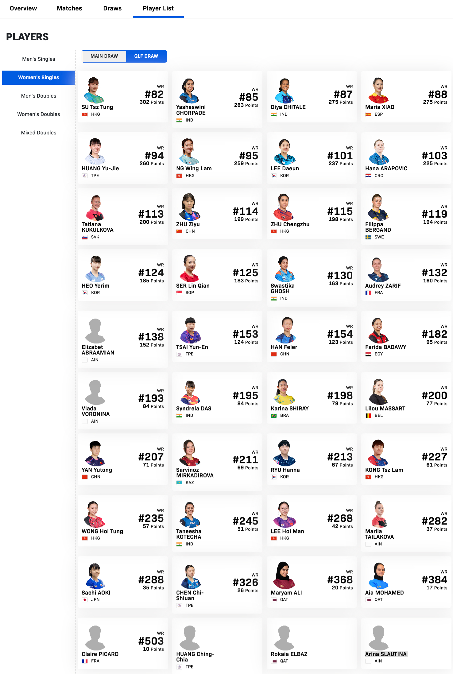 WTT球星挑战赛多哈站1.13-1.18丨女单外协参赛名单【正赛】朱雨玲🇲🇴、申裕斌🇰🇷、大藤沙月🇯🇵、木原美悠🇯🇵、朱芊曦🇰🇷、郑怡静(中国台北)、袁嘉楠🇫🇷、普莉蒂卡·帕瓦德🇫🇷、金娜英🇰🇷、佐藤瞳🇯🇵、李恩惠🇰🇷、索菲亚·波尔卡诺娃🇦🇹、横井咲樱🇯🇵、曾尖🇸🇬、杜凯琹🇭🇰、蒂娜·梅谢芙🇪🇬、叶伊恬(中国台北)、安娜·赫西🏴、芝田沙季🇯🇵、安妮特·考夫蔓🇩🇪、玛尼卡·巴特拉🇮🇳、平野美宇🇯🇵、娜塔莉娅·巴约🇵🇱、金成珍🇰🇷、梁夏银🇰🇷、玛利亚姆·阿尔霍达比🇪🇬【资格赛】苏籽童🇭🇰、娅莎诗维妮·格尔帕德🇮🇳、迪亚·帕拉戈·奇塔莱🇮🇳、肖瑶茜🇪🇸、黄愉偼(中国台北)、吴咏琳🇭🇰、李多恩🇰🇷、哈娜·阿拉波维奇🇭🇷、塔蒂娜·库库洛娃🇸🇰、朱成竹🇭🇰、菲利帕·博嘉德🇸🇪、许玴玪🇰🇷、舒麟茜🇸🇬、斯维斯蒂卡·戈什🇮🇳、奥黛丽·扎里夫🇫🇷、伊丽莎白·阿布拉米安(AIN)、蔡昀恩(中国台北)、法里达·巴达维🇪🇬、弗拉达·沃罗宁娜(AIN)、辛德瑞拉·达斯🇮🇳、卡琳娜·希雷🇧🇷、利楼·马萨特🇧🇪、萨维诺兹·米尔卡迪罗娃🇰🇿、柳汉娜🇰🇷、江芷林🇭🇰、黄凯彤🇭🇰、塔尼莎·科特查🇮🇳、李凯敏🇭🇰、玛丽亚·泰拉科娃(AIN)、青木咲智🇯🇵、陈琦媗(中国台北)、玛丽亚姆·阿里🇶🇦、艾雅·穆罕默德🇶🇦、克莱尔·皮卡德🇫🇷、黄净嘉(中国台北)、罗卡亚·埃尔巴兹🇶🇦、阿丽娜·斯劳蒂娜(AIN)