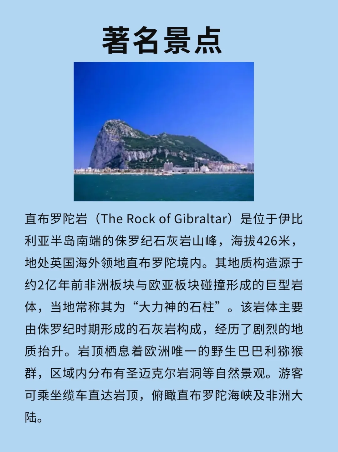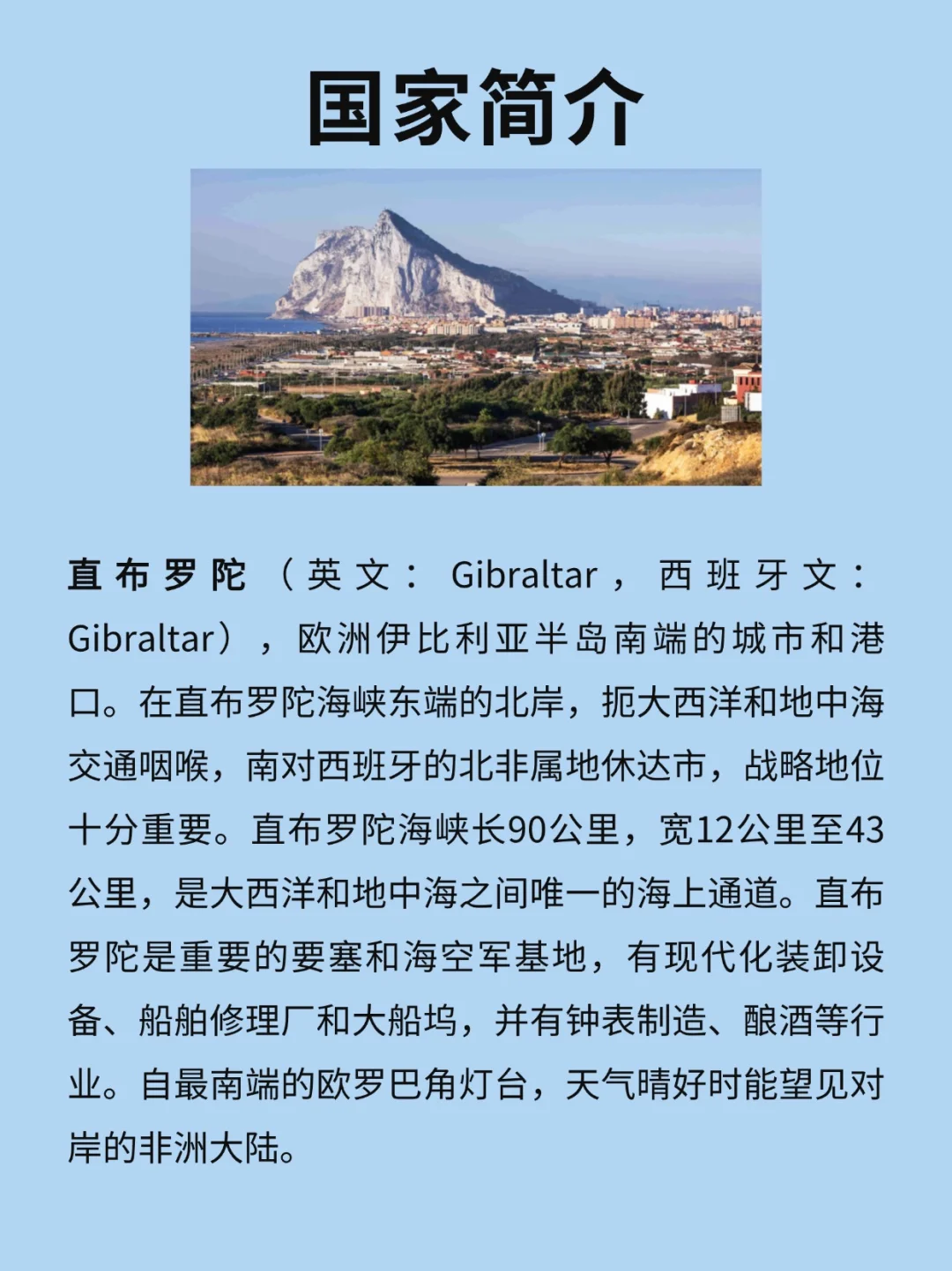 直布罗陀(英文:Gibraltar,西班牙文:Gibraltar),欧洲伊比利亚半岛南端的城市和港口。 [打卡R]在直布罗陀海峡东端的北岸,扼大西洋和地中海交通咽喉,南对西班牙的北非属地休达市,战略地位十分重要。 直布罗陀海峡长90公里,宽12公里至43公里,是大西洋和地中海之间唯一的海上通道。 [私信R]直布罗陀是重要的要塞和海空军基地,有现代化装卸设备、船舶修理厂和大船坞,并有钟表制造、酿酒等行业。 [飞盘R]自最南端的欧罗巴角灯台,天气晴好时能望见对岸的非洲大陆。 -