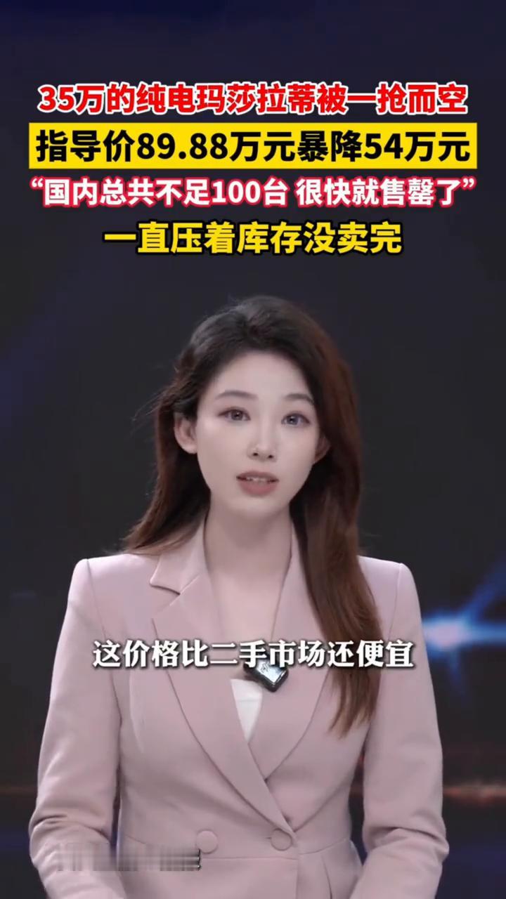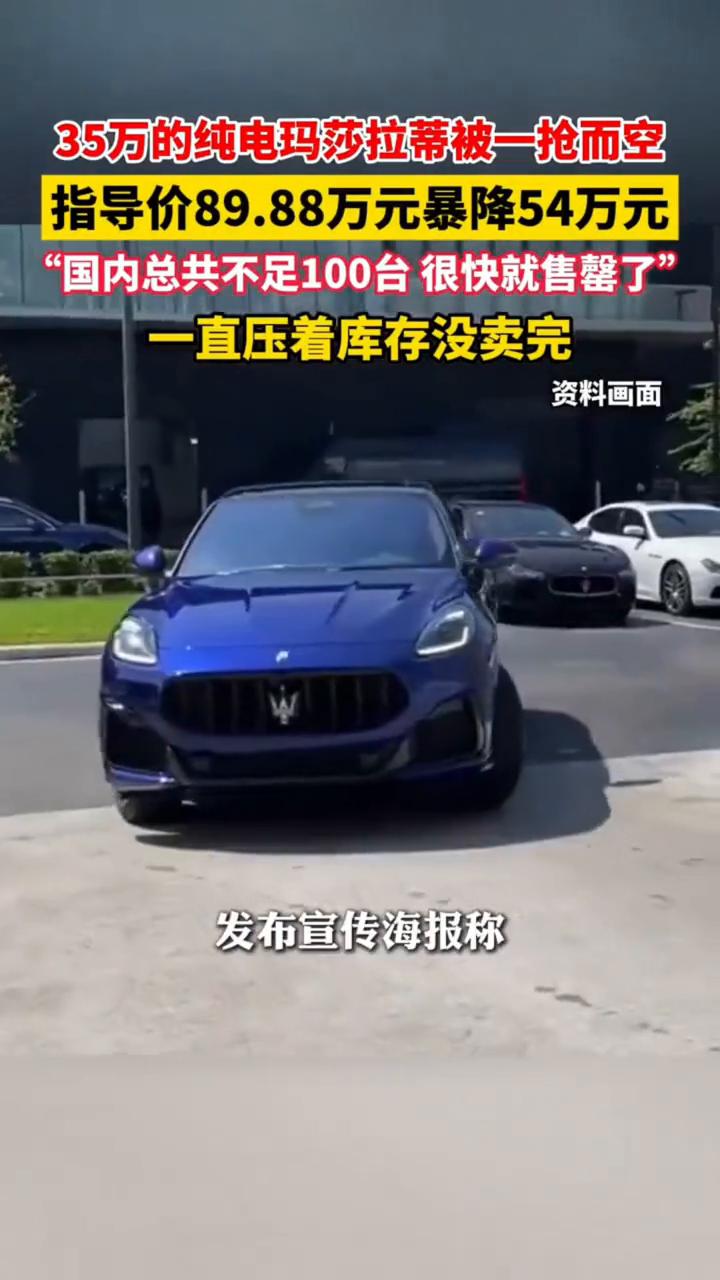 35万的纯电玛莎拉蒂被一抢而空,指导价89.88万元暴降54万元,"国内总共不足100台很快就售罄了",一直压着库存没卖完。 35万的玛莎拉蒂你心动吗?近日多地玛莎拉蒂门店发布宣传海报称,纯电版的格雷嘉只要35.88万起。一销售表示,纯电版格雷嘉官方指导价为89.88万元,降价后裸车价格只要35.88万元,等于暴降54万元,这价格比二手市场还便宜。 海报发出后门店电话被打爆,加上国内总共不足100台,目前现车已经卖完。不过有销售透露,事实上玛莎拉蒂只生产了这一批纯电版格雷嘉,因为一直压着库存没卖完,之后大概率也不会再生产。所以销售们并不建议客户买纯电版,因为保有量小,万一以后出现问题维修会很麻烦,配件很难找。 不少网友认为,在新能源车领域,玛莎拉蒂在智能化、实用性配置上很难与新势力抗衡。