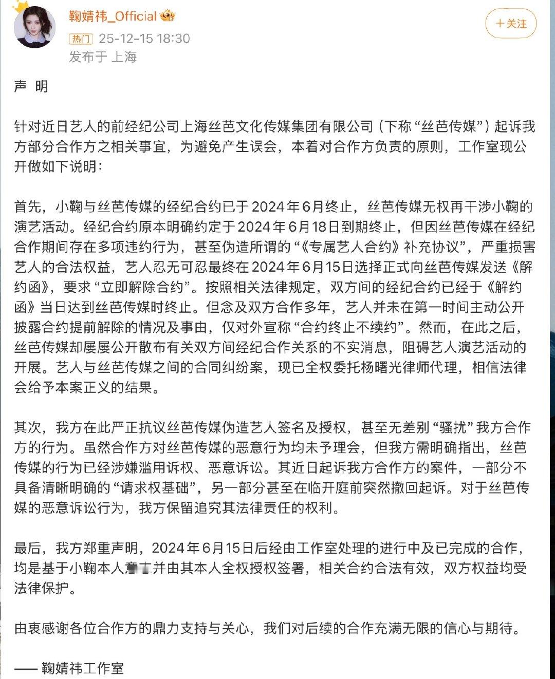 丝芭传媒无权再干涉鞠婧祎的演艺活动丝芭传媒无权再干涉鞠婧祎的演艺活动