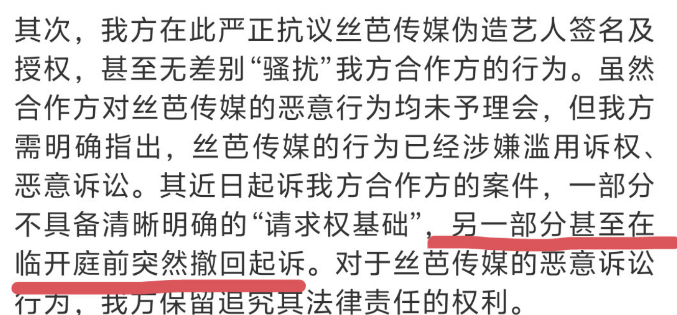 鞠婧祎和丝芭之间的事情还没完啊丝芭明显就是拖时间罢了,吃瓜群众都看不下去了拿着存疑的协议硬扯合约没到期,不去正面掰扯核心纠纷,反而追着合作方瞎折腾起诉又撤诉的反复,既没占到理,还把自己的吃相越描越难看。与其在台前上蹿下跳,不如好好理理合约的事儿,这么闹下去,只会让行业更看轻罢了。