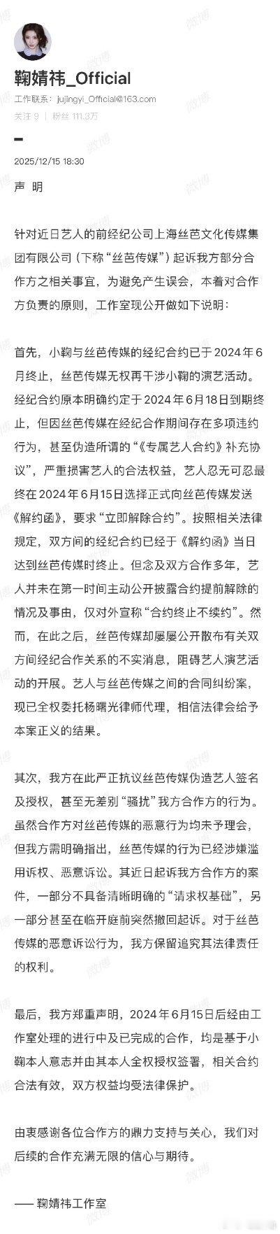 合约撕到2033?鞠婧祎硬刚老东家,伪造签名+骚扰合作方太离谱12月15日