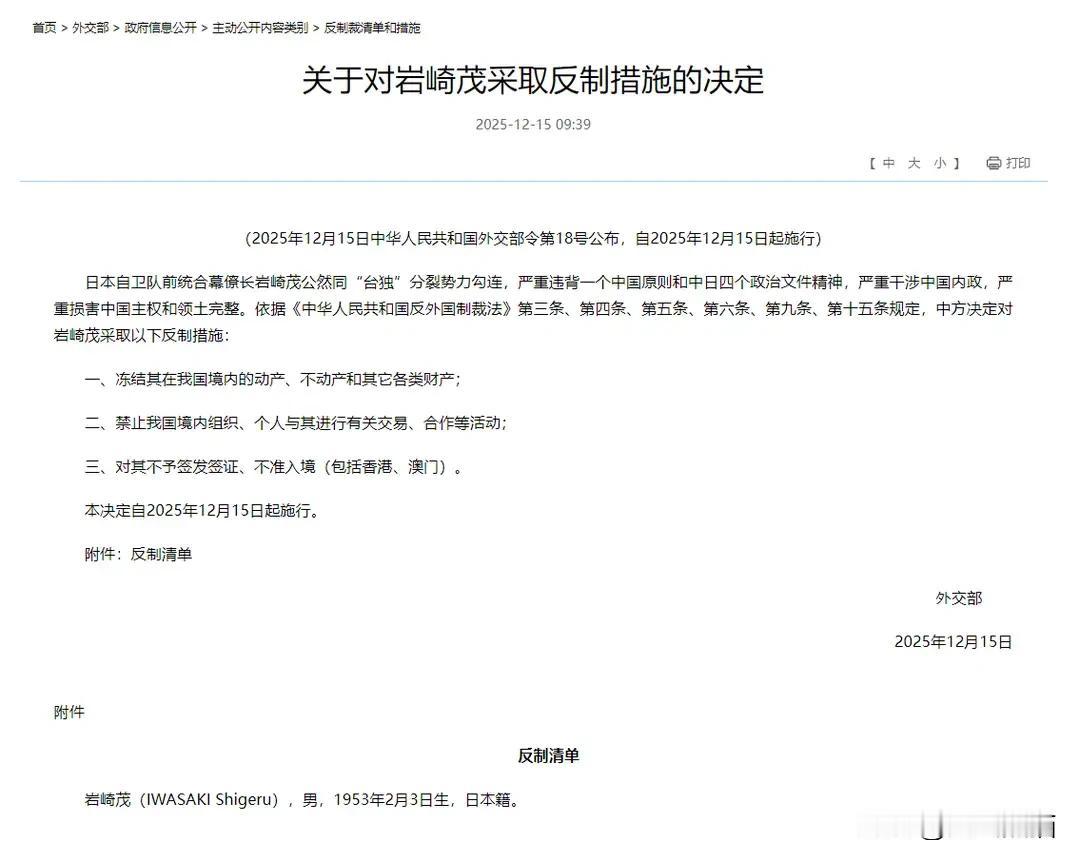 终于出手了!这次对于日本的自卫队前高官进行制裁,也是近几十年来的首次。 中方要对日本自卫队前统合幕僚长岩崎茂采取一系列的反制措施。 这也是对于那些勾结台独分子的有力回击,岩崎茂作为曾经的日本自卫队前一把手,不断的在台湾问题上搞事情,并且要出任台湾方面所谓的“政务顾问”。 如果不对这样的行为进行反制,日本和台湾真的有可能会穿上同一条裤子,因此,出手是必要的。