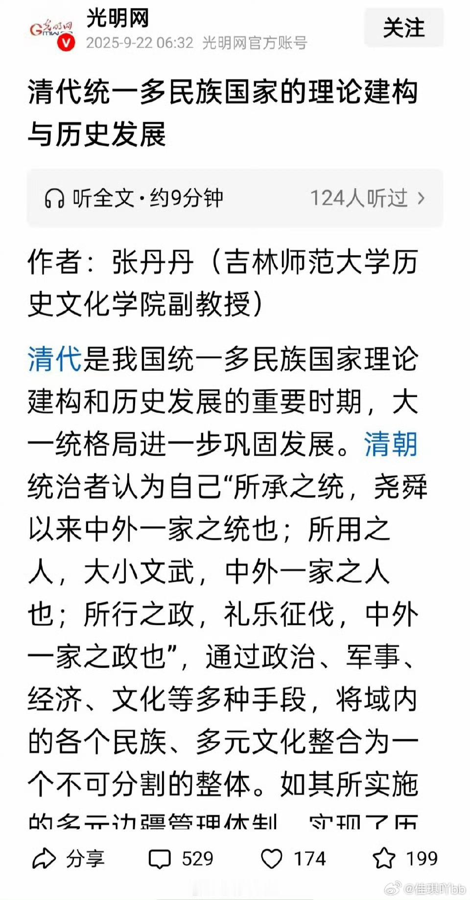 《光明日报》说清朝为统一多民族国家做出了历史性的贡献。
