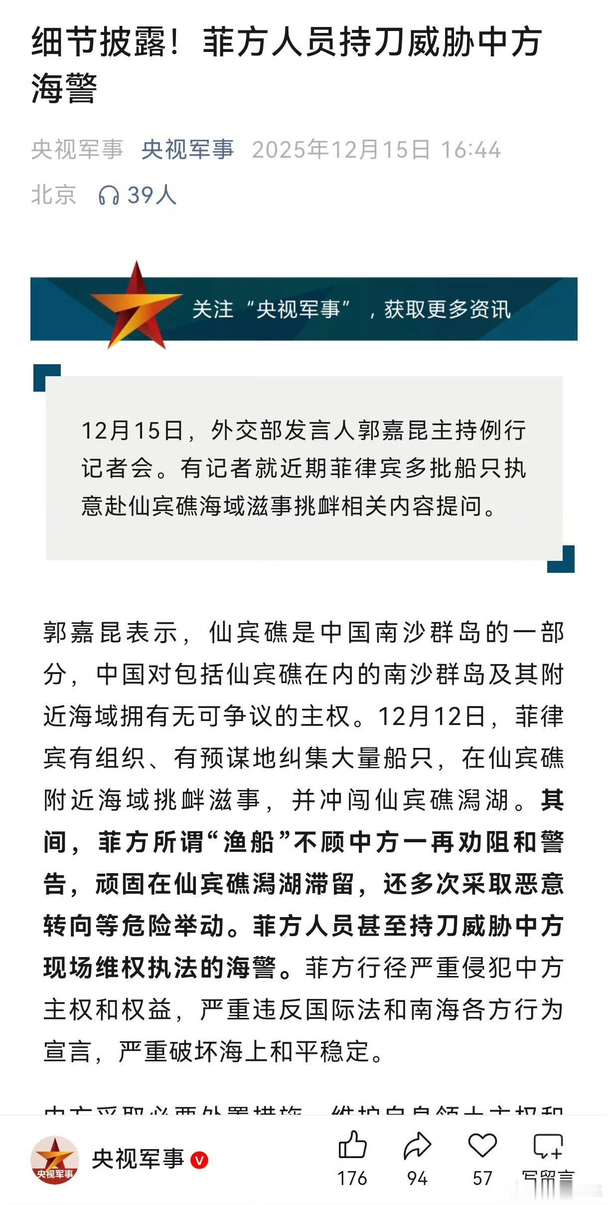 菲律宾可能觉得自己又行了,居然动用刀子威胁中国海警,看来还是执法太文明有必要强化手段。12月12日,菲律宾组织了大量船只,前往仙宾礁附近海域挑衅,同时冲闯仙宾礁潟湖。不顾中方劝阻和警告,还在仙宾礁潟湖滞留,菲方人员甚至还持刀威胁中方执法海警。 不定时组织舰机冲闯已经成为常态,所以水炮驱离对菲律宾来说还是太客气,船只轻微损坏回去修一下就可以再来。要不就如网友说的,在水炮里夹点沙子可能效果会更好;或者抓扣非法侵闯船只人员,这样威慑效果可能更好。