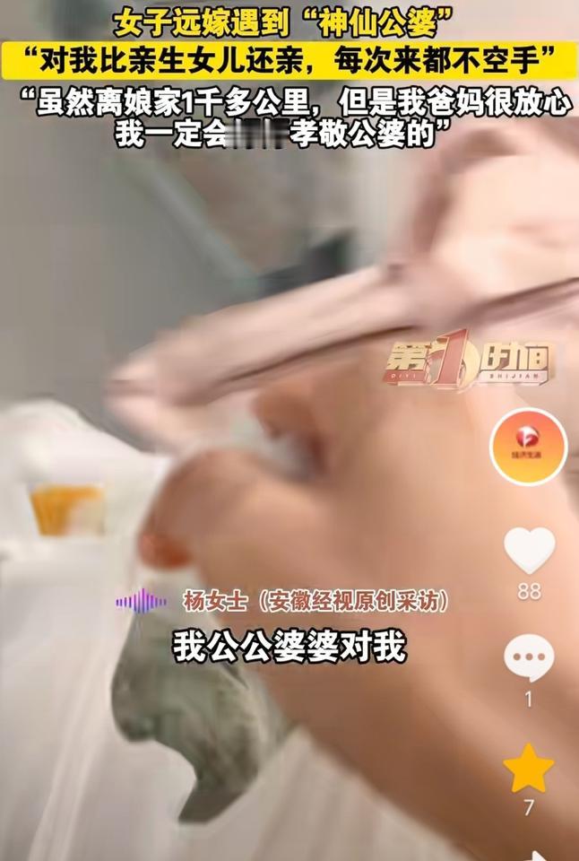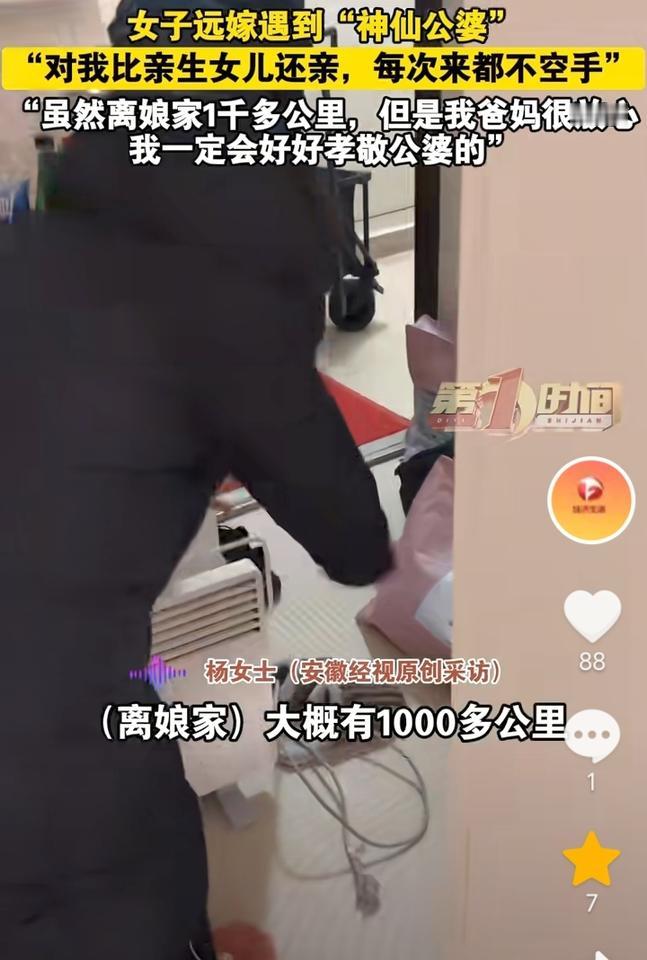 “十年看婆,十年看媳”!辽宁沈阳,女子远嫁到1000多公里外的沈阳,结婚快6年了,公婆对她比亲生女儿还要亲,每次去都不空手,平时自己舍不得买的水果每次来都会给儿媳买吃。女子表示,有这样的公婆爸妈也很放心,自己也会好好孝顺他们。 虽然女子远嫁,但是只要过的好,公婆对她也好,父母肯定也是会很放心。 虽然说女的嫁对男人很重要,但是有一个好的公婆也是非常重要的,因为有好的公婆家里会避免很多不必要的矛盾。 俗话说“十年看婆,十年看媳”,明智的婆婆都不会对儿媳差,因为有些东西都是互相的,每个人都会有老的时候。 家和才能万事兴,希望所有的家庭婆媳都能和平相处。