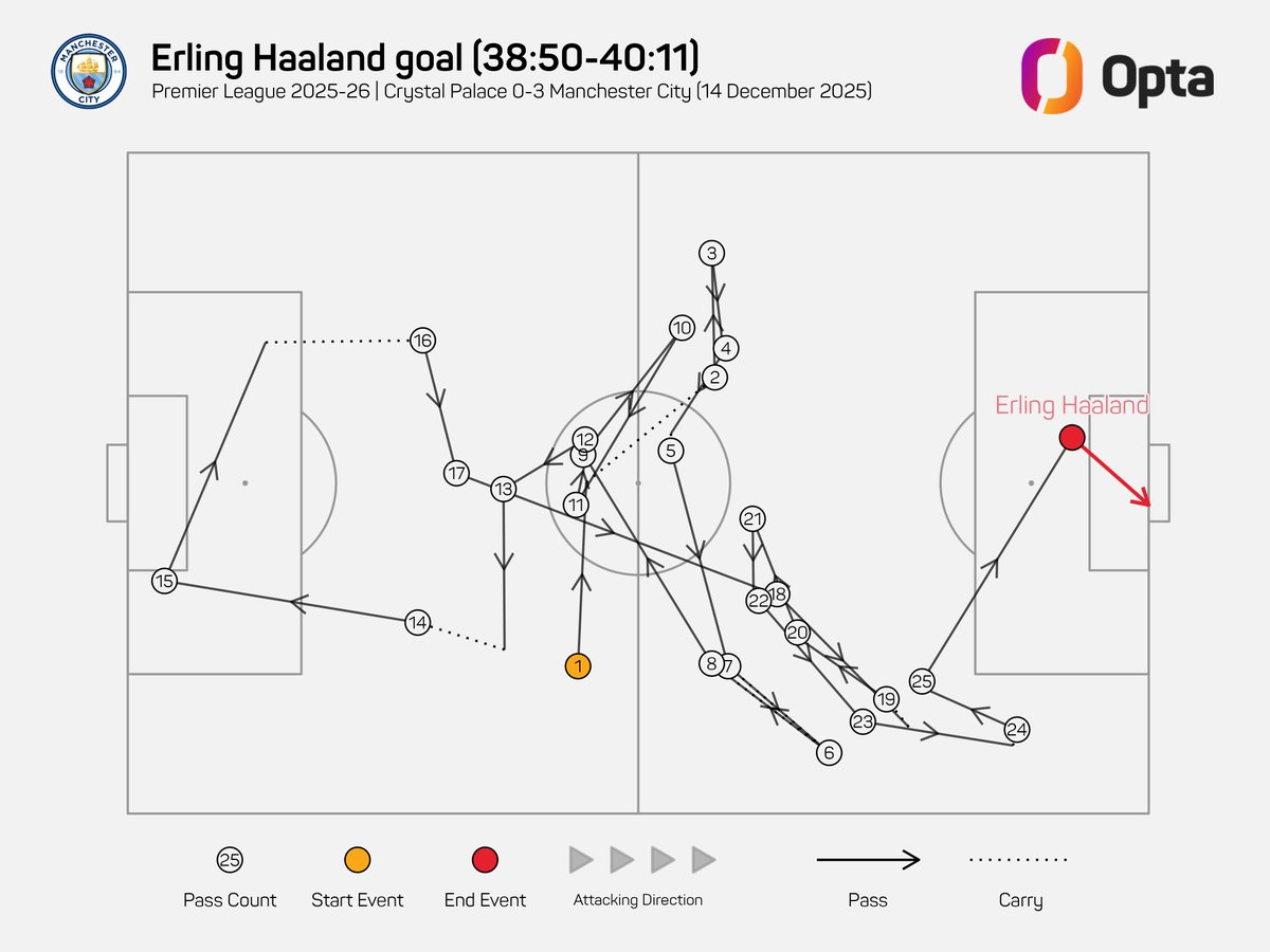 在哈兰德打进首开纪录的进球之前,曼城在进攻组织过程中一共完成了25次传球。这是自 2024 年5月罗德里对阵西汉姆联的进球(31次传球)以来,曼城在英超联赛中一次进球前所经历的最多传球次数。