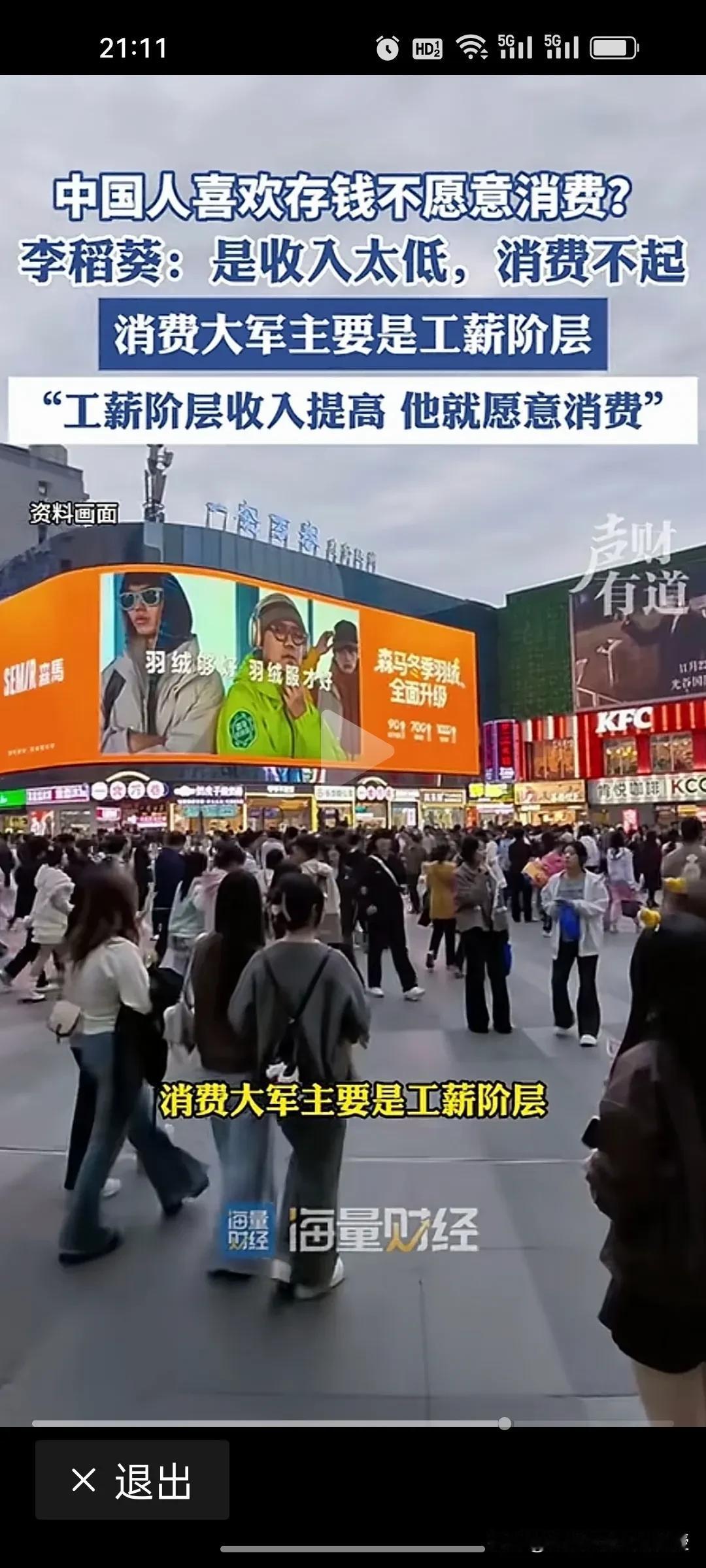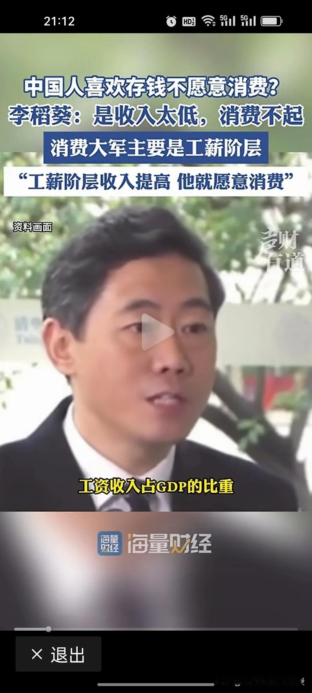 看下图,李稻葵确实说出了一番“中国人喜欢存钱不愿意消费”的大实话。 看一组数据,美国人消费意愿较强,个人消费常年占美国GDP的68%左右,是经济核心驱动力,我国消费支出对GDP增长的贡献率52%,比美国低16%,也低于全球中等收入国家55%的平均水平,仍有较大提升空间。因此明年的“国补”将继续,“扩大内需”仍然是我国连续说了十年的重要战略。 李稻葵则说出了不愿意消费的核心原因就是工资低,工薪阶层收入提高,他们自然会消费。今年年内的重要高层会议中连续提了六次“涨工资”,尤其是给中低收入者涨工资,国家发改委近期也说了,各地政府给民企欠款的年底必须要结清,让企业能够有充分的现金流,本质都是在给消费“铺路”。只有老百姓口袋里的钱真真切切变多,大家才敢消费、愿消费,经济增长才会有持续的内生动力。