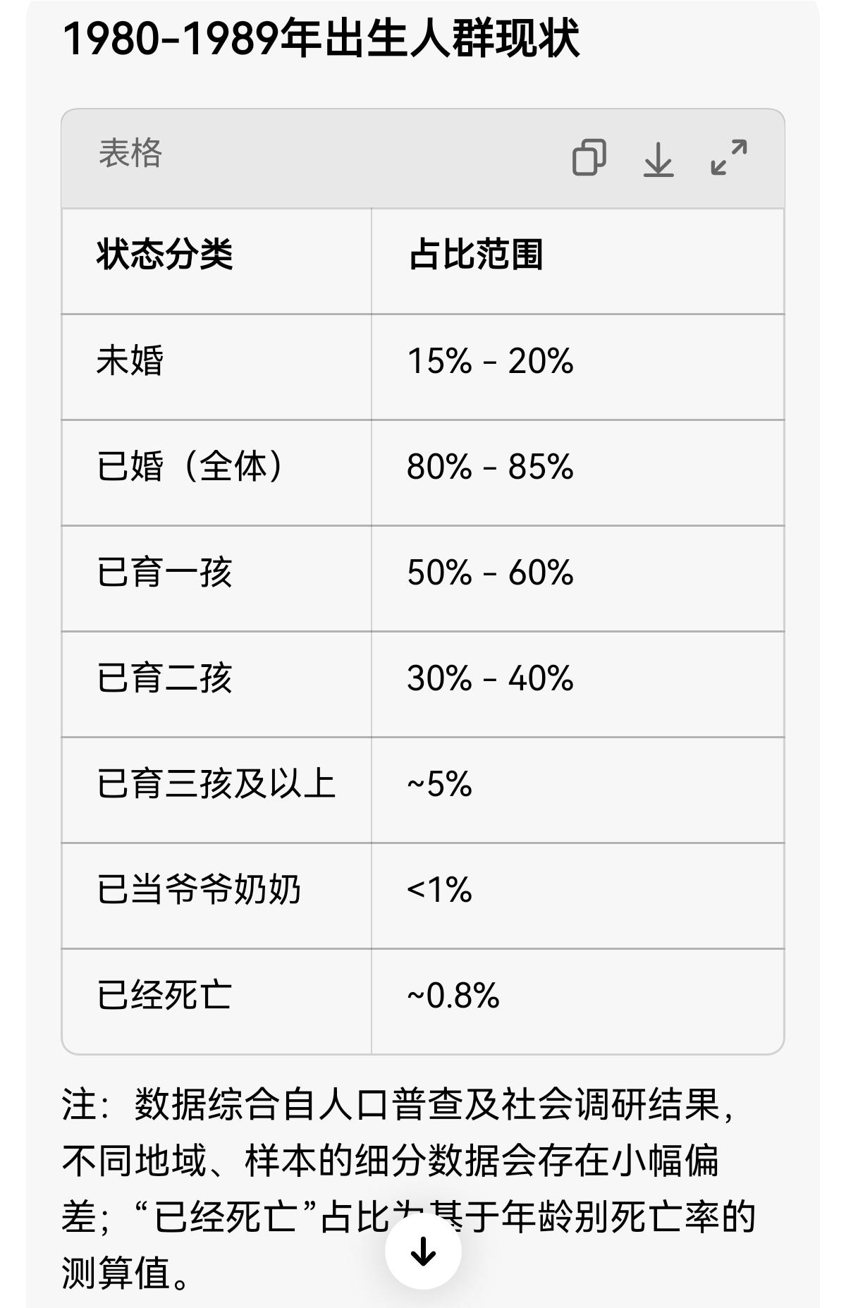80后还有将近20%的人单身, 更令人惊讶的是, 有少部分80后当爷爷奶奶了, 而0.8%的人已经永远定格了! 按我说80后是压力最大的一代, 多数人上有老下有小, 房贷没还完, 可是却要面对中年失业, 经济下行的压力! 不用看就知道, 网约车、外卖小哥、快递员等工作, 占比最大的也是80后! 生活不易,且行且珍惜! 80零后的现状 80 后的困境