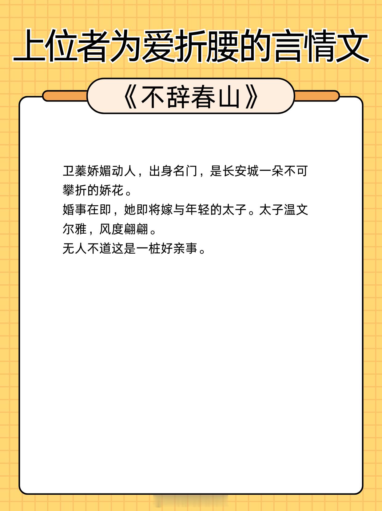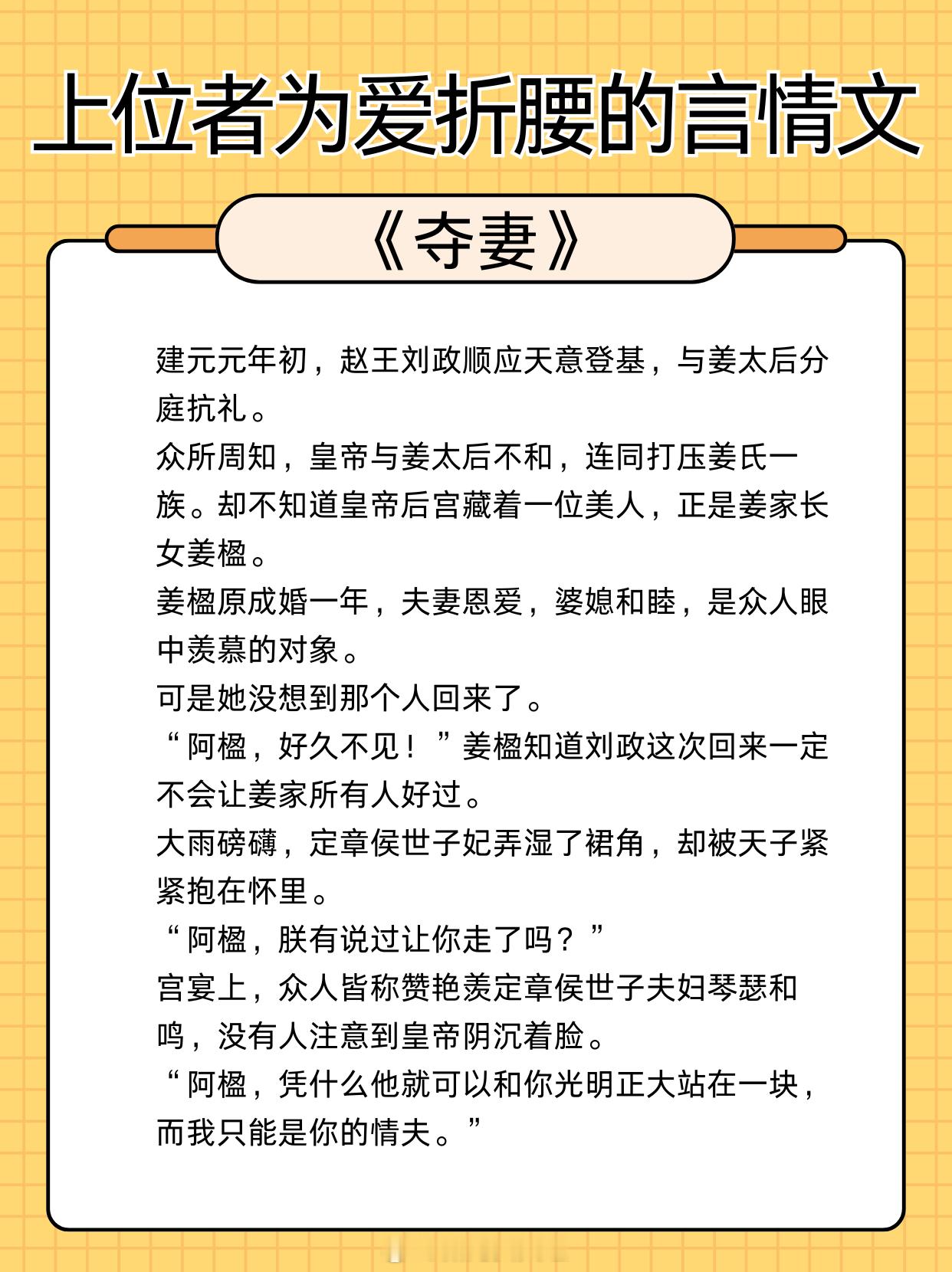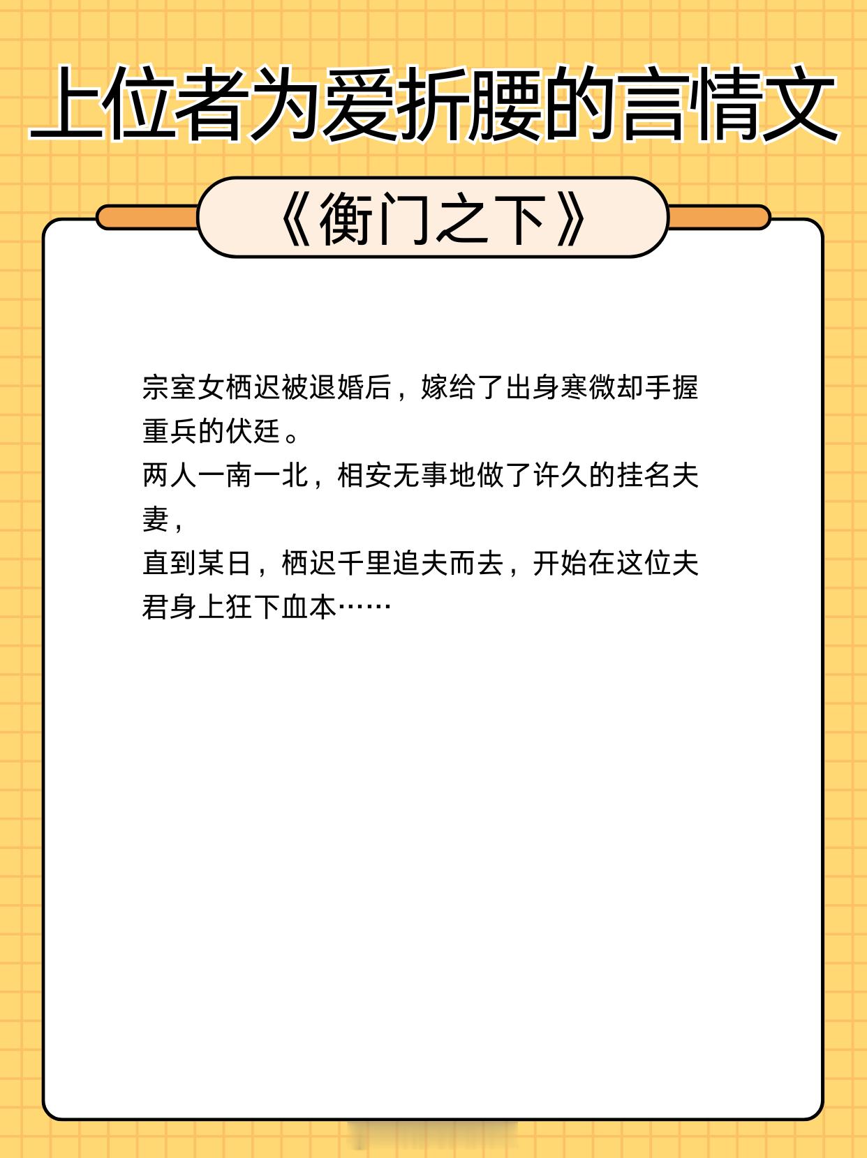 上位者为爱折腰的言情文,苦寻三年那人却就在身后。1、《尚公主》作者:伊人睽睽2、《思无涯》作者:翘摇3、《衡门之下》作者:天如玉4、《春江花月》作者:蓬莱客5、《望春山》作者:假面的盛宴6、《榜下贵婿》作者:落日蔷薇7、《反派之妻》作者:木妖娆8、《不辞春山》作者:灿摇9、《夺妻》作者:连棠这小说写在我心趴上了 网文界的诸神之战