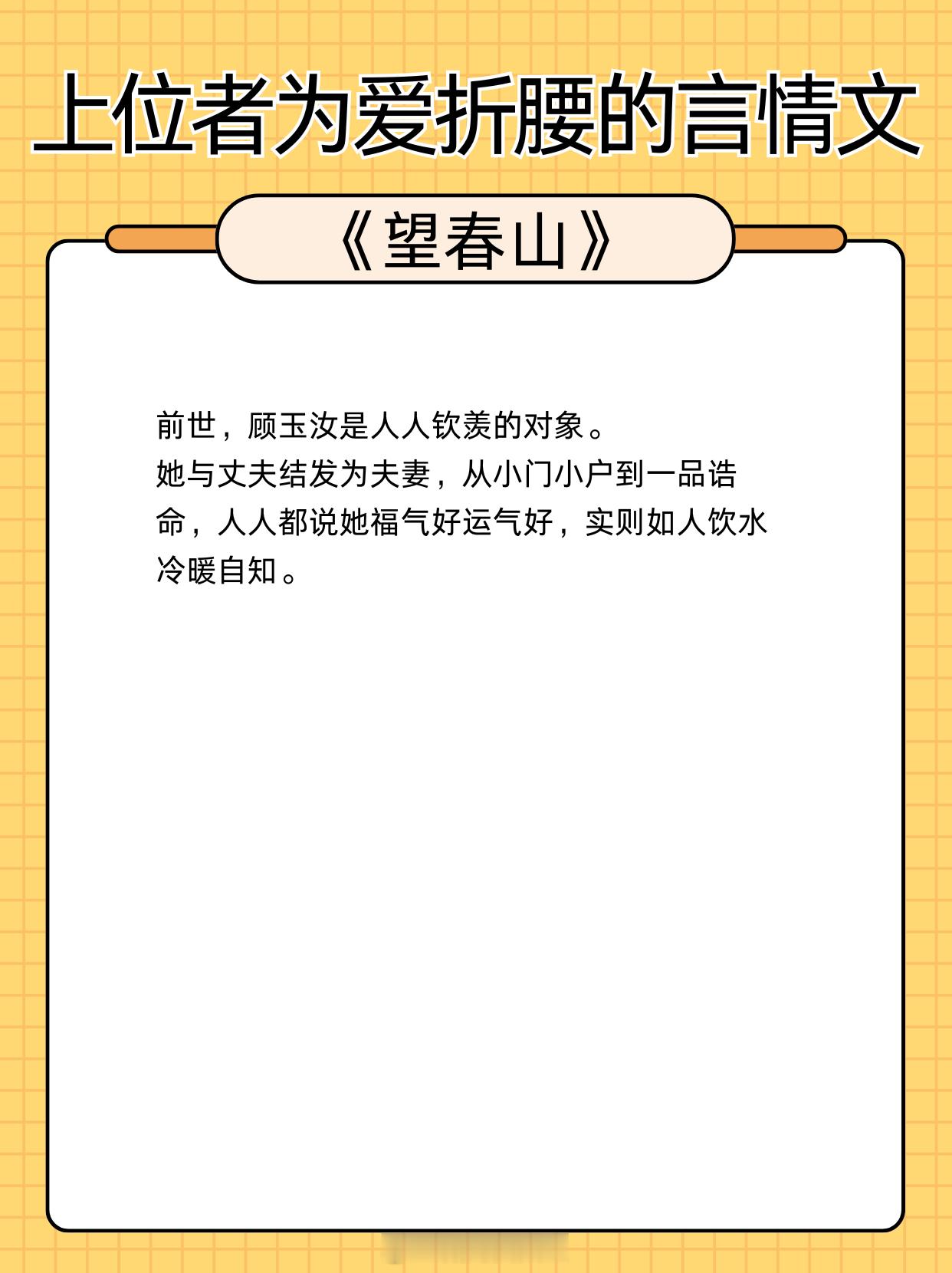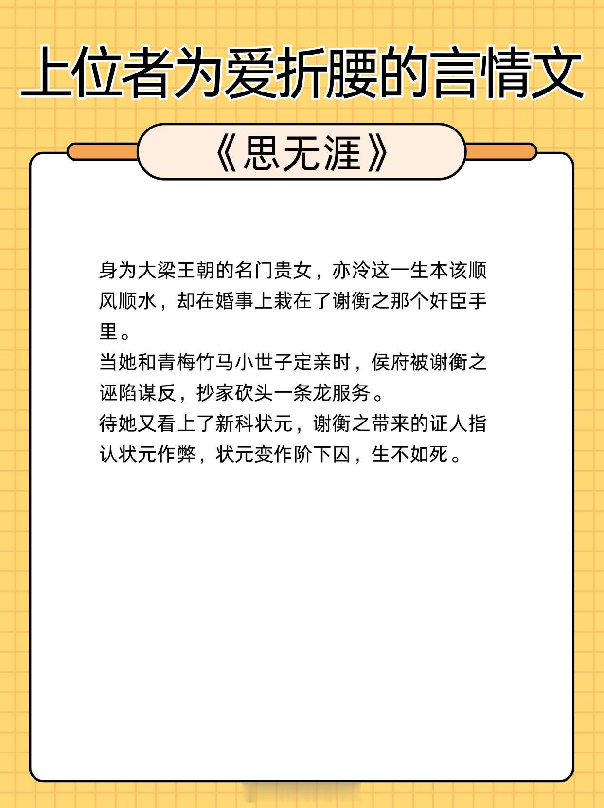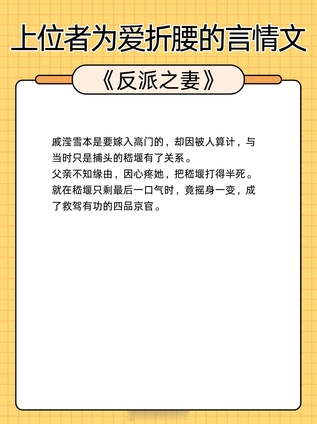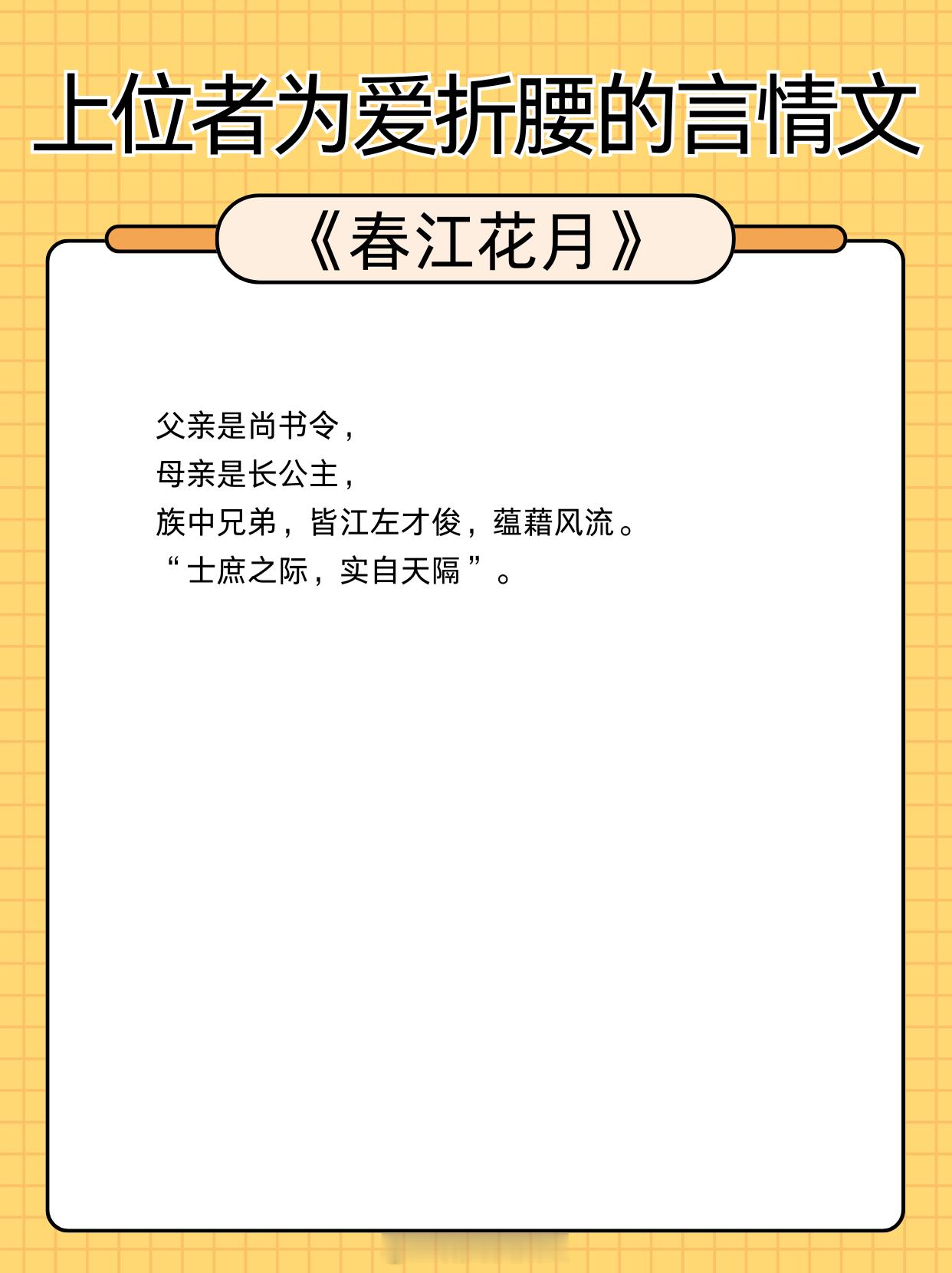 上位者为爱折腰的言情文,苦寻三年那人却就在身后。1、《尚公主》作者:伊人睽睽2、《思无涯》作者:翘摇3、《衡门之下》作者:天如玉4、《春江花月》作者:蓬莱客5、《望春山》作者:假面的盛宴6、《榜下贵婿》作者:落日蔷薇7、《反派之妻》作者:木妖娆8、《不辞春山》作者:灿摇9、《夺妻》作者:连棠这小说写在我心趴上了 网文界的诸神之战