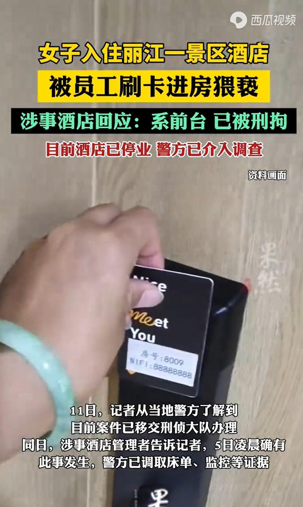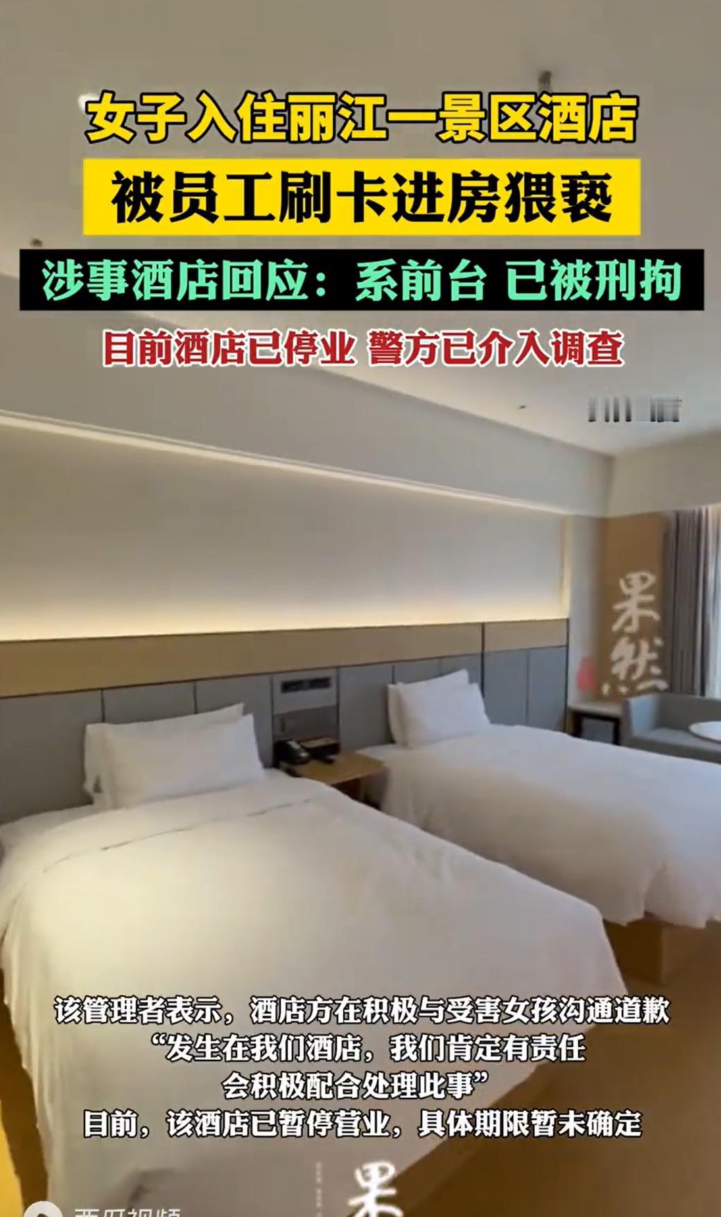 云南丽江,一女游客入住某湖景酒店,因晚间与朋友小聚饮酒,带着醉意被酒店前台员工搀扶回房休息。谁曾想,凌晨时分,客房门突然传来“嘀”的刷卡声,该员工利用前台总卡擅自打开了她的房门,对女游客实施了不法侵害。女游客惊醒后选择报警,警方迅速立案,并以涉嫌强 奸 罪刑拘了该员工。酒店随即停业整顿,管理者承认存在管理责任,表示愿依法赔偿。   2025年12月初,女游客林雨(化名)为了散心,去丽江泸沽湖旅游,选择了湖畔一家度假民宿入住。   12月3日、4日两晚的住宿原本平静。然而,12月5日凌晨发生的事,彻底打破了这片宁静,也让她随后的生活蒙上了厚重的阴影。   据林雨回忆,12月4日晚上,她与在当地认识的朋友小聚,席间饮了些酒,她自称“有点喝多了”,回到酒店时已是深夜,状态晕沉。   根据其后酒店管理方对媒体的陈述,当晚是酒店一名前台员工与另一人将她扶回了房间。这一点,双方的说法在初始环节存在交叉。   林雨回到房间后便躺下休息,房门是否关妥,她当时已记不清晰。   大约在5日凌晨,那名之前扶她回房的酒店前台员工,竟然使用酒店的总卡刷开了她的房门,进入房间并对她实施了侵犯。   林雨描述,自己当时虽因酒精作用“不是特别清醒能马上做出反应”,但清楚地知道正在发生什么。   惊惧与无助中,林雨熬到了天亮。   12月5日当天,林雨选择了报警,警方迅速介入,经审查,认为此事符合刑事立案标准,决定以嫌疑人涉嫌强 奸 案进行立案侦查。   不久后,涉案的酒店男性前台员工被警方依法刑事拘留,公开信息显示,该员工入职仅三个月。   12月8日,林雨通过个人社交账号连续发帖讲述遭遇,她的诉求主要集中在几个方面:其一,她认为事发后,酒店方面仅将问题归咎于员工个人,管理层态度回避,“老板一概不知情”;   其二,林雨未收到来自酒店或景区管理方的正式道歉,她感受到极大的精神压力,自称“精神状态不太好,不敢一个人出门,看到异性也挺害怕的”。   面对汹涌的舆情和警方的调查,酒店方于12月11日采取了暂停营业的措施。   12月12日,酒店一名管理者确认涉事员工已被警方带走,酒店正全力配合调查,并承认酒店在此事上“肯定有一部分责任”,但他也指出,林雨的网帖内容“部分有出入”。   他特别提到,林雨当晚与包括该员工在内的人员曾一起饮酒,员工是出于帮忙将其扶回房间。至于具体是用客人房卡还是酒店总卡开的门,他认为有待警方最终认定。   该管理者还表达了一丝无奈,称酒店曾多次尝试通过短信联系林雨,但未获回应,他们愿意承担应有的赔偿责任,但希望林雨通过民事诉讼等正式法律途径提出,酒店将依据生效的法律文书履行责任。   同时,酒店方面对林雨户籍所在地警方报警,称其网络发帖影响了酒店经营,这一行为被林雨质疑为“非法获取私人信息”。   目前,案件正在进一步侦办中。   那么,从法律角度,这件事如何看待呢?   《刑法》二百三十六条规定,以暴力、胁迫或者其他手段强J妇女的,处三年以上十年以下有期徒刑。   第二百三十七条规定,以暴力、胁迫或者其他方法强制猥xie他人或者侮辱妇女的,处五年以下有期徒刑或者拘役。   本案中,林雨在网络表述中使用了“猥xie”,但警方《立案告知书》显示以涉嫌“强J案”侦查,这表明警方在初查中可能掌握了指向更严重犯罪的线索或被害人陈述。   若经侦查证实存在发生关系行为,则需重点审查“意志”要件。在被害人林雨“喝得有点晕”、“不是特别清醒能马上做出反应”的状态下,其认知能力和反抗能力可能显著削弱。   此时,男员工如利用被害人林雨处于不能、不知或不敢反抗的状态与之发生关 系,即可认定为“违背妇女意志”。   而其利用酒店工作身份和总卡进入房间,亦可视为一种制造孤立无援情境的“其他手段”,涉嫌构成该罪。   不过,若侦查结果证实嫌疑人实施的是发生关系意外的侵 害行为,且同样违背了被害人意志,则可能构成强制猥 亵罪。   在实践中,在案件初期证据尚待全面固定时,警方有时会以更严重罪名立案以涵盖侦查范围,后续可能根据证据变化变更罪名。   此外,《民法典》第一千一百九十八条规定,宾馆……等经营场所、公共场所的经营者、管理者或者群众性活动的组织者,未尽到安全保障义务,造成他人损害的,应当承担侵权责任。   具体到本案,涉事员工入职仅三个月即发生严重事件,酒店在招聘审核、日常教育和行为监督上可能存在疏漏。   而前台员工能擅自使用总卡进入已入住客人的房间,这说明酒店的门禁管理存在重大漏洞。   在员工将醉酒客人送回房间后,酒店未建立后续的确认或巡查机制,未能及时发现和阻止员工再次非法进入。   以上问题说明,酒店存在管理过错,未尽合理安全保障义务,可能要承担赔偿责任。   对此,您怎么看?