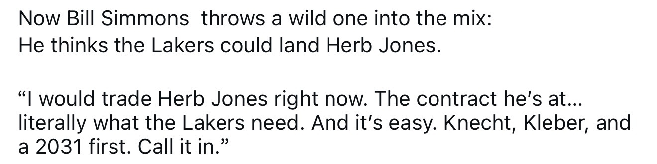 名嘴Bill Simmons:“如果我是湖人,我想交易得到赫伯·琼斯,以他目前的合同……这简直是湖人最需要的,而且操作起来很容易。用克内克特、克勒贝尔和一个2031年首轮签,直接敲定吧。”