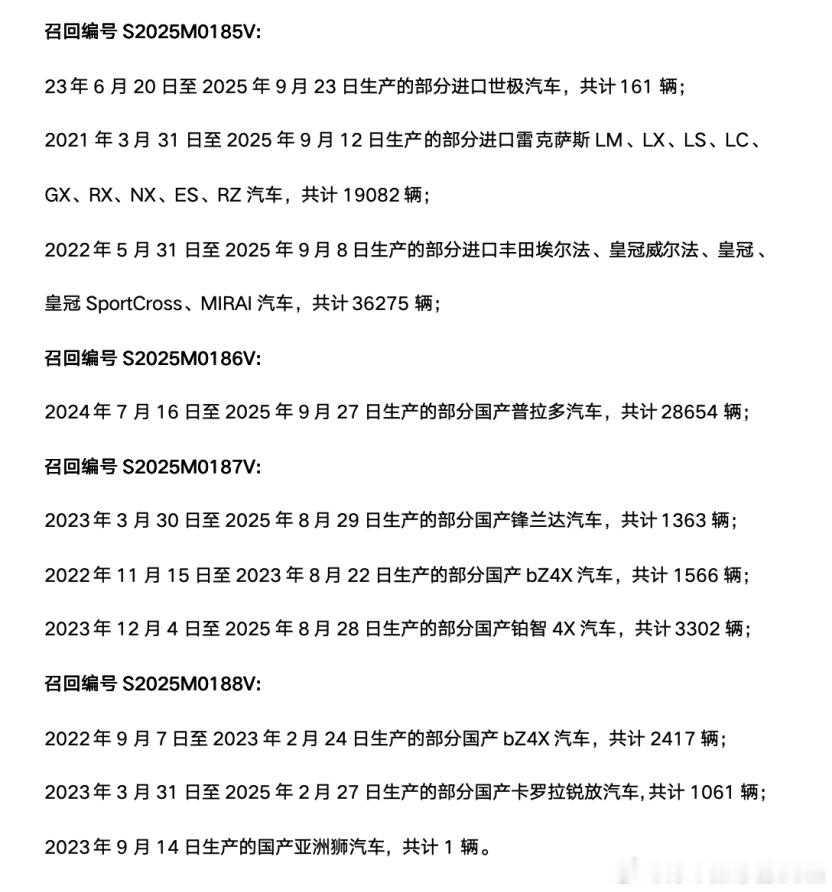 丰田召回多款车型,您的爱车上榜了吗?日前,丰田中国向国家市场监督管理总局备案了召回计划,决定召回多款车辆(详见图片),此次召回的原因主要是因为全景监控系统程序设计不当,该问题体现在如果驾驶员启动车辆后立即倒车,全景影像画面可能出现错位、卡滞、无法显示等情况,所以存在安全隐患。大家可以根据车型信息自查一下,是否属于相关召回批次,不知道屏幕前的各位是否存在过丰田车全景影像画面的问题?欢迎评论区讨论交流。丰田中国
