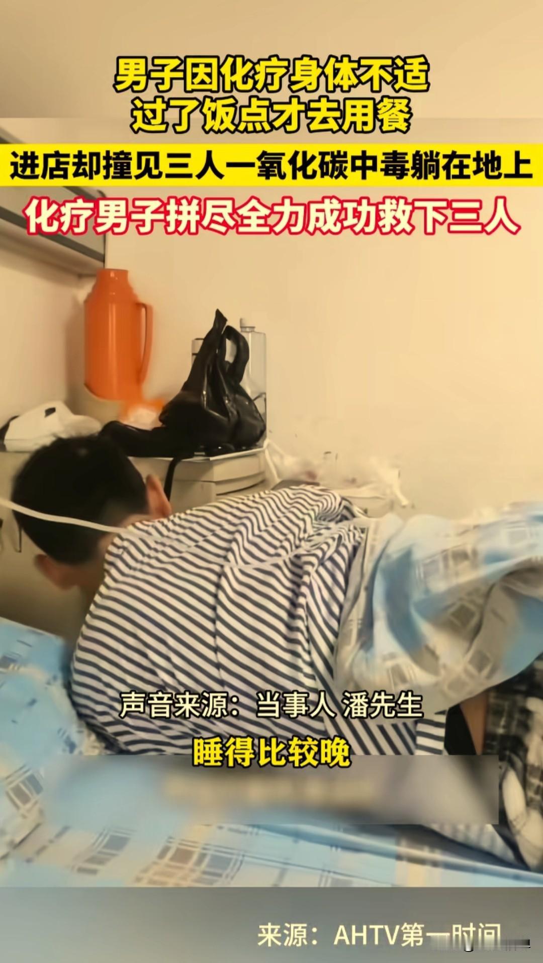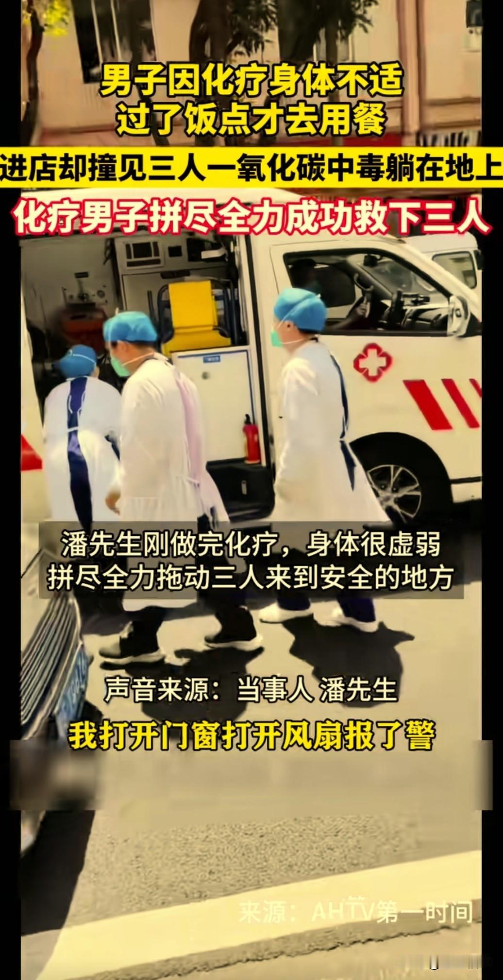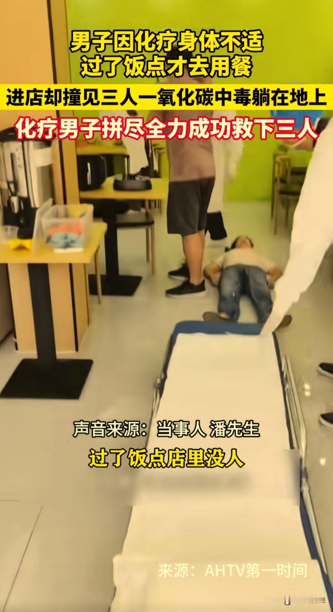 近日在广东佛山,27岁的小伙潘先生,因不幸得了肝癌,在医院住院期间,刚做完化疗身体不太舒服,就睡到中午三点才去吃饭,没有胃口想吃点清淡的,就去吃肠粉。 一进店里就发现大厅晕倒躺着两个人,厨房也有一个阿姨躺在地上,潘先生敏锐的发现他们可能是一氧化碳中毒,进去厨房检查了煤气罐没有关。 身体虚弱的他立即采取行动,关了煤气,把他们全拖到大厅,打开门窗通风并打开了电风扇,然后打了报警电话和120电话叫了救护车。 过了两天民警联系了潘先生,说因为他及时的发现和正确的处置,3个人都已经脱离危险了,最严重的那位厨师大哥也救过来康复了,成功避免了一起悲剧的发生。