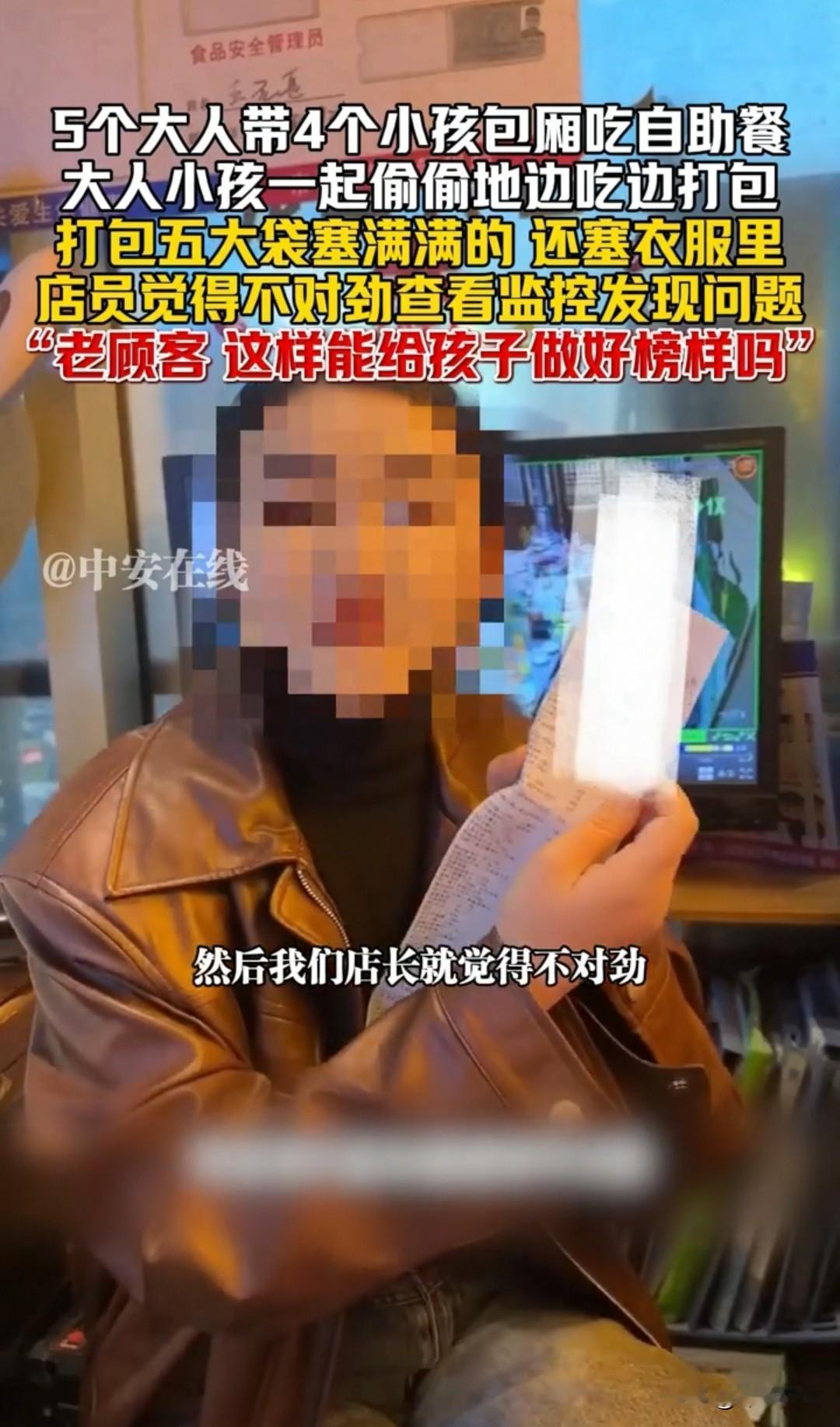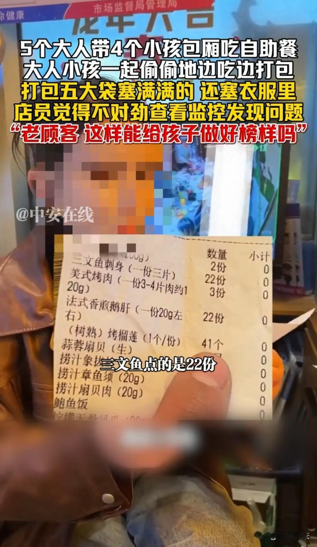 乌鲁木齐,五个大人带着四个孩子去吃自助餐,一进包厢就指使孩子们拿高价食材,往书包里塞、往口袋里揣,把书包和口袋都塞得鼓鼓囊囊,还对着孩子竖大拇指喊“真乖”。这些大人全程躲在后面指挥,压根把娃当成偷东西的“挡箭牌”。店长看孩子们拿的食材也太多了,明显超出正常吃饭的量,觉得特别不对劲,赶紧查了监控,这才看清这让人膈应的一幕。 一家自助餐厅里,5个大人带着4个孩子,在包厢里干了件挺难看的事——三文鱼一盘接一盘往塑料袋里塞,M7和牛裹着纸巾塞进羽绒服,连捞汁扇贝、无骨鸡爪都没落下,最后足足装了五大袋。 更让人不舒服的是,孩子们成了他们的“小帮手”,踮着脚递袋子、钻到桌底藏东西,小小的身影在包厢里忙个不停。 这群人还是餐厅的老顾客,“自助餐只能在店里吃、不能外带”的规矩,他们肯定早就知道。可他们不光明知故犯,还把孩子当成了“挡箭牌”和“工具人”。 监控拍得清清楚楚:一个中年男人一边盯着包厢门防着店员,一边让身边的小男孩把装满三文鱼的袋子塞进书包;还有个女人假装喂孩子吃饭,趁没人注意,把几片M7和牛塞进了孩子的衣角。 孩子们哪儿懂这些啊,只知道照着大人的话做,就能得到一句“真乖”的夸奖,压根没意识到,自己正在被教着偷偷拿别人的东西。 他们打包的可不是普通菜——三文鱼是餐厅按份给的高档海鲜,肉嫩还不便宜,他们一下子点了22份; M7和牛更是自助餐里的好东西,这种日本良种牛肉,脂肪分布得像大理石花纹,吃着比普通牛肉嫩多了,M7这个等级的,每份都得几十块,他们足足打包了10份。 再加上11份捞汁章鱼须、11份扇贝肉、9份无骨鸡爪,这些贵价食材加起来的成本,差不多够好几个人的餐费了,可他们就用这种偷偷摸摸的方式,把餐厅当成了免费的超市。 最让人担心的是,大人的贪心正在悄悄毁了孩子的是非观。 孩子看着大人为了占便宜,躲躲藏藏、互相打掩护,还觉得撒谎是“聪明”、违规是“本事”,他们心里对“对和错”的判断就全乱了。今天帮着藏一袋三文鱼,可能觉得只是“拿点吃的”; 明天在学校里,就可能偷偷拿走同学的文具,觉得“没人发现就行”;等长大了,说不定会为了利益投机取巧、不把规则当回事,而这一切的根儿,就在小时候这场大人亲手教的“坏榜样”。 这些大人可能觉得自己占了大便宜,花一顿自助餐的钱,打包了值上千块的食材,却不知道自己亏得有多惨。 他们丢的不只是做人的面子和诚信,还有孩子对他们的信任,以及孩子心里最宝贵的道德底线。 从小就被教着“为了好处能打破规则”的孩子,长大了很难有真正的责任感和同理心,可能会在与人相处中失信,在工作中耍小聪明,最后被社会淘汰。 餐厅后续报了警,处理结果清晰明了:涉事的几名大人需要向餐厅赔偿偷偷打包的三文鱼、和牛等高价食材的费用; 警方会对他们进行严肃的批评教育,重点指出教唆孩子参与此类行为的错误;此外,根据他们违规打包食材的价值和具体情节,警方还可能对这几名大人处以罚款。 一、自助餐偷偷打包高价食材,这不是占小便宜,而是明确的盗窃行为 根据《刑法》第二百六十四条规定,盗窃公私财物,数额较大或多次盗窃的需承担刑事责任;未达刑事标准的,也违反《治安管理处罚法》第四十九条,可处五日以上十日以下拘留并处罚款。 涉事大人指使孩子打包22份三文鱼、10份M7和牛等高价食材,总价值近千元,以藏匿方式非法占有财物,完全符合盗窃构成要件。 二、让孩子帮忙打包,这不是普通使唤孩子,而是教唆未成年人实施不良行为的违法举动 《预防未成年人犯罪法》第二十九条规定,任何人不得教唆、引诱未成年人实施不良行为,违者将受治安处罚;《刑法》第二十九条明确,教唆不满十八周岁的人犯罪应从重处罚。 涉事大人明知打包违规,却指使认知不足的孩子参与,还以“竖大拇指夸真乖”强化错误行为,本质是利用孩子作“挡箭牌”的教唆行为。 三、自助餐“禁止外带”,这不是商家单方面规定,而是具有法律约束力的合同约定 《民法典》第五百一十条指出,合同内容未明确约定的按交易习惯确定。“仅限堂食、禁止外带”是自助餐行业普遍交易习惯,消费者就餐即默认该约定,私自打包属于违约。 商家若已明示规则,消费者仍违规,商家有权要求返还食材或赔偿损失,该约定受法律保护。 对于此事,大家如何看? 素材来源于:中安在线2025年12月15日