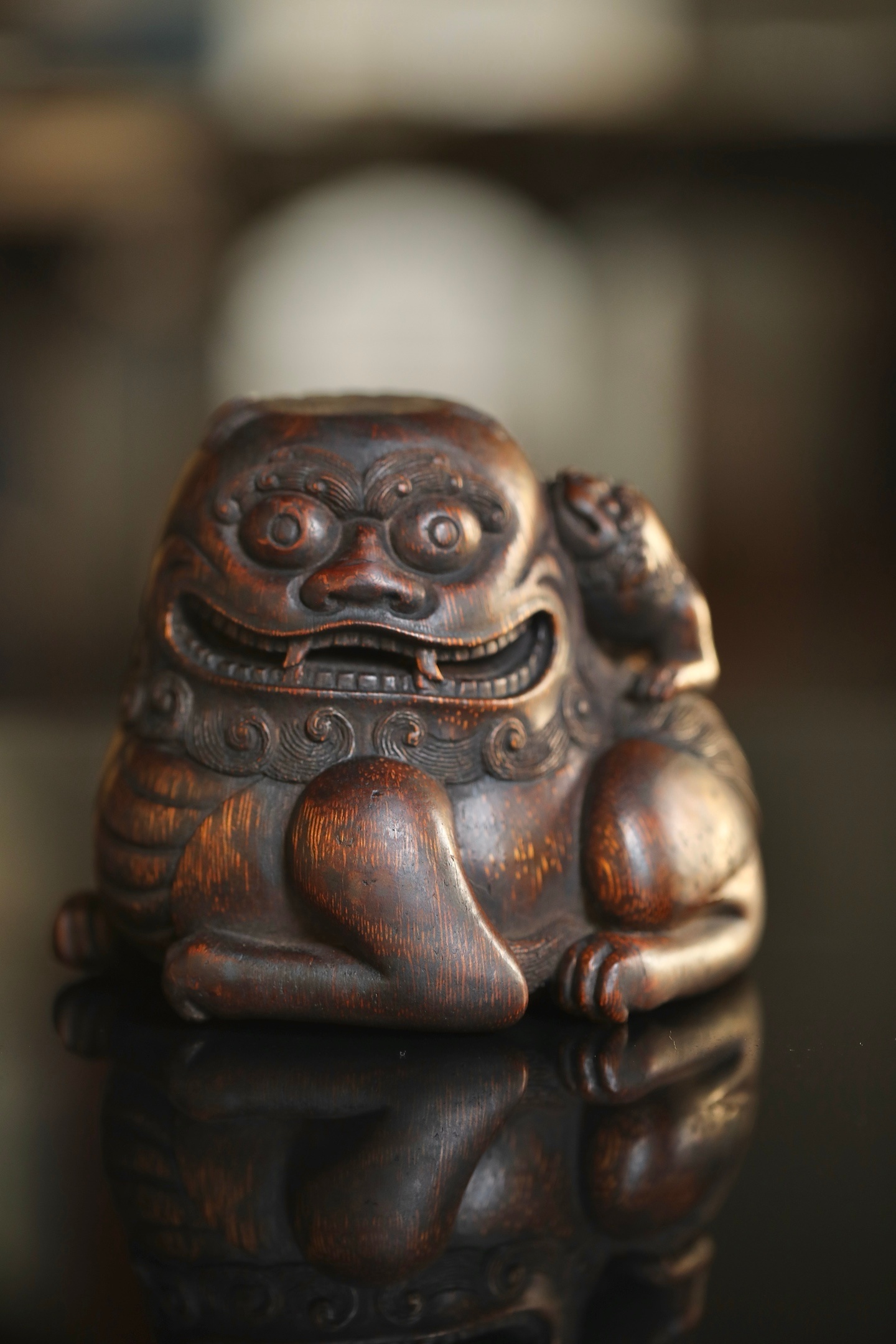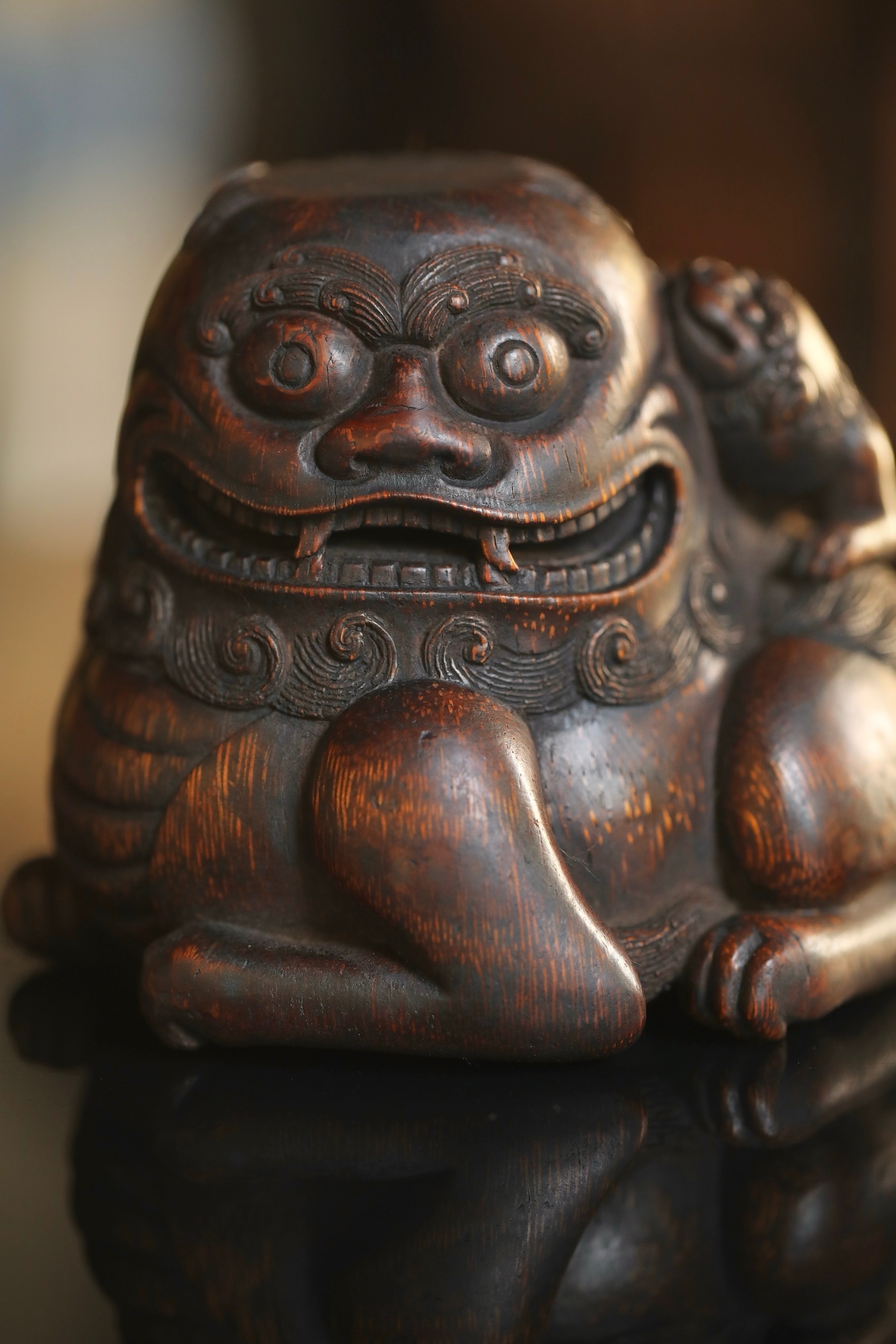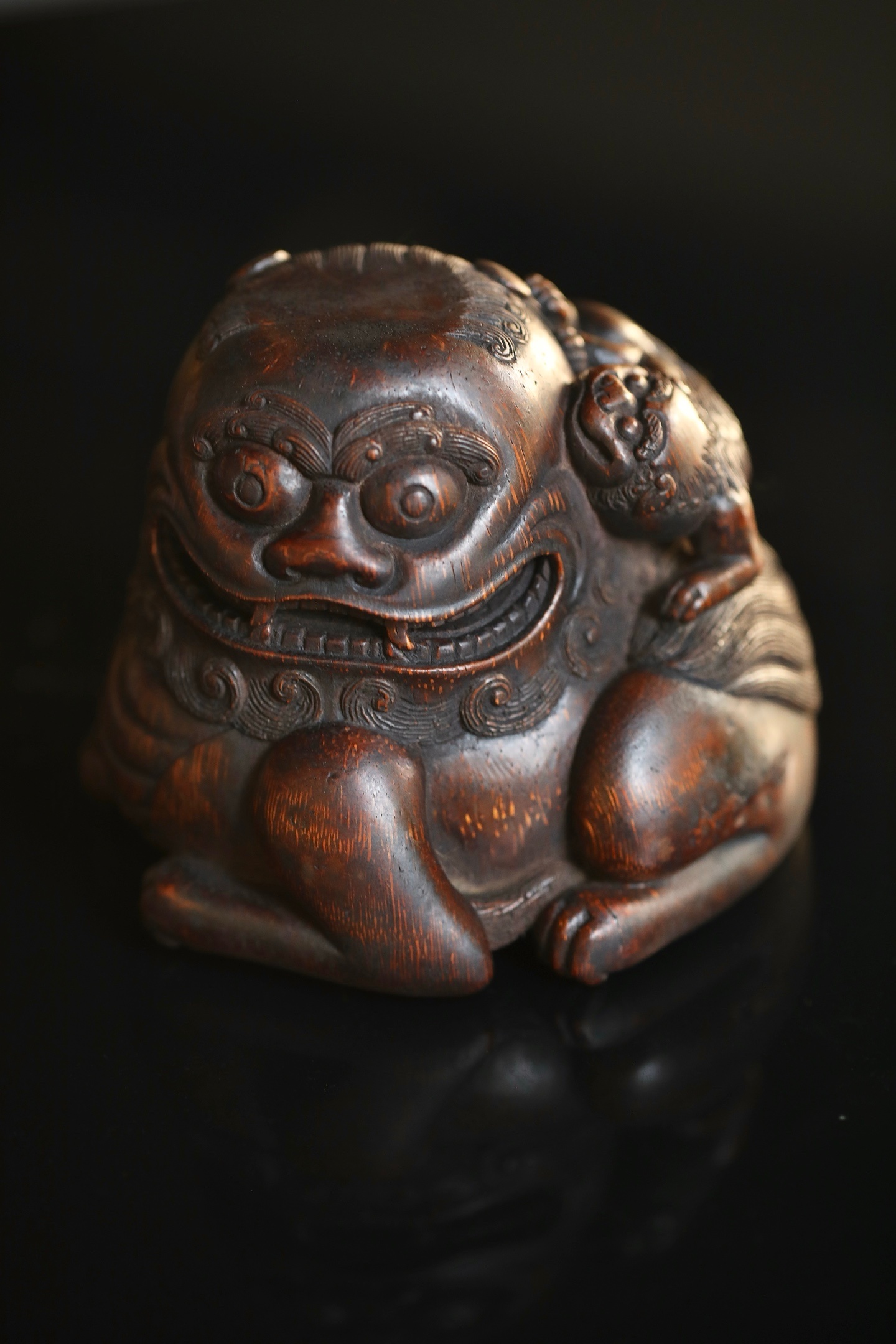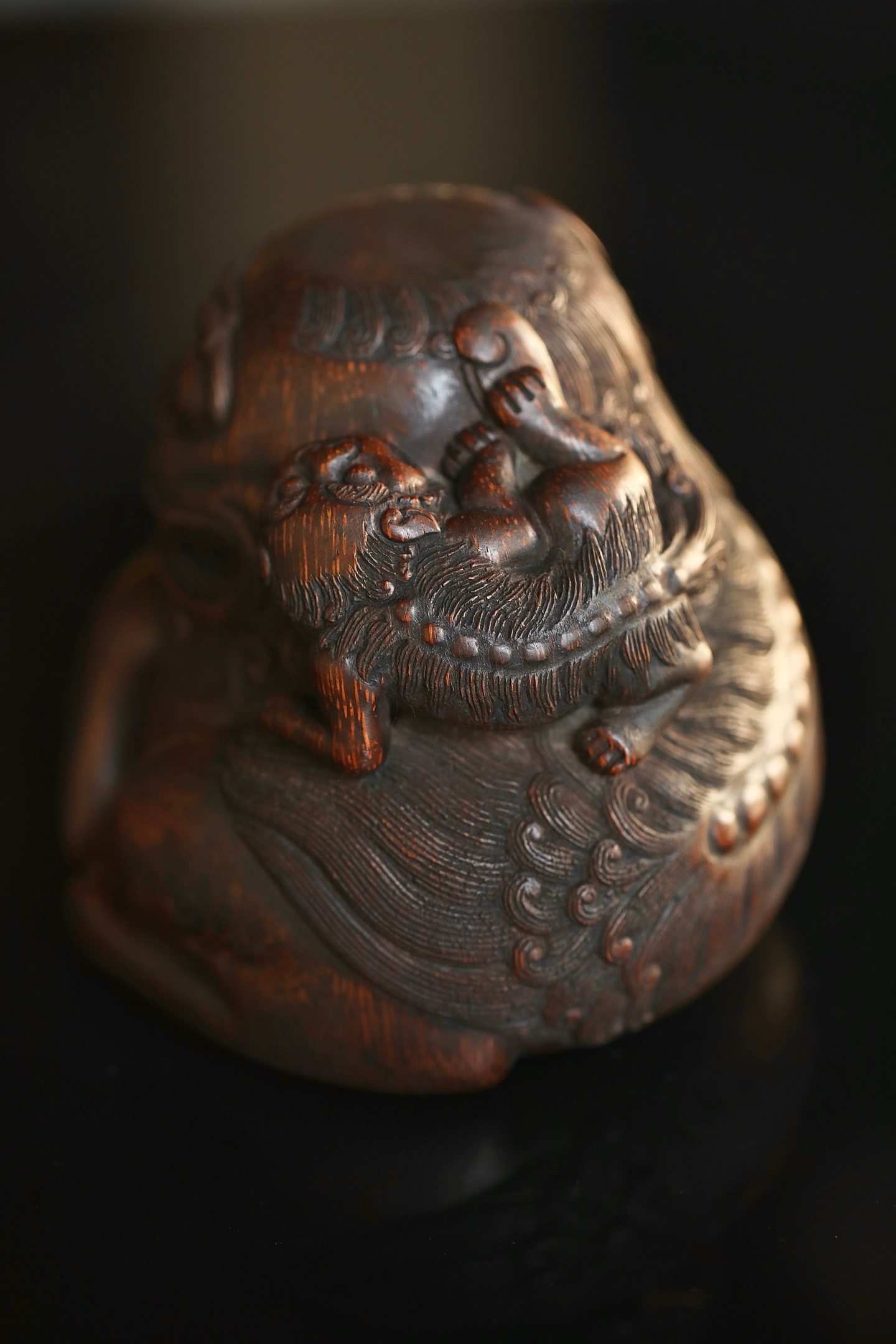 竹雕|太师少狮这尊老竹根雕的狮子,没有威武的张牙舞爪,反倒带着几分憨态可掬,