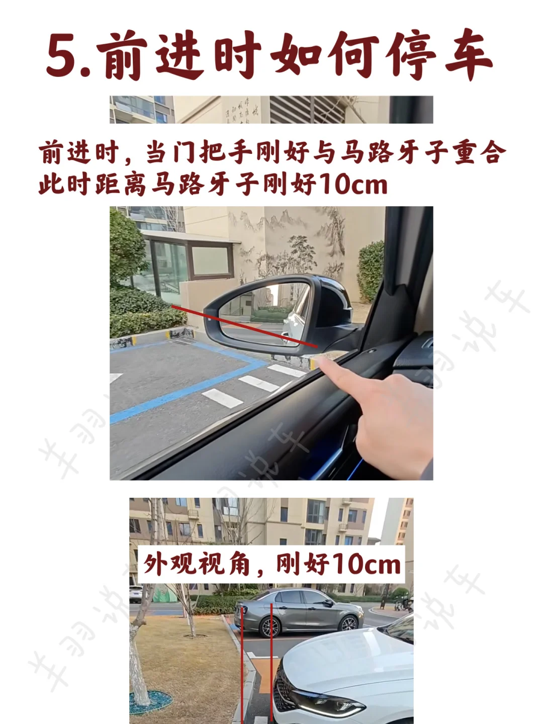 前进时,观察后视镜中前门把手,当门把手与马路牙子重合时,此时停车,刚好车头距离马路牙子10cm。