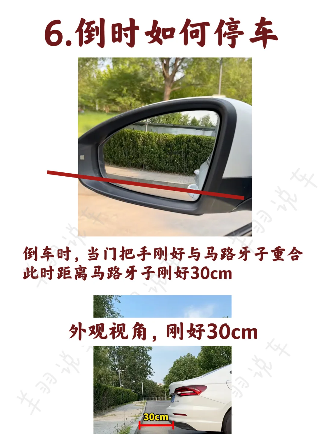 前进时,观察后视镜中前门把手,当门把手与马路牙子重合时,此时停车,刚好车尾距离马路牙子30cm。
