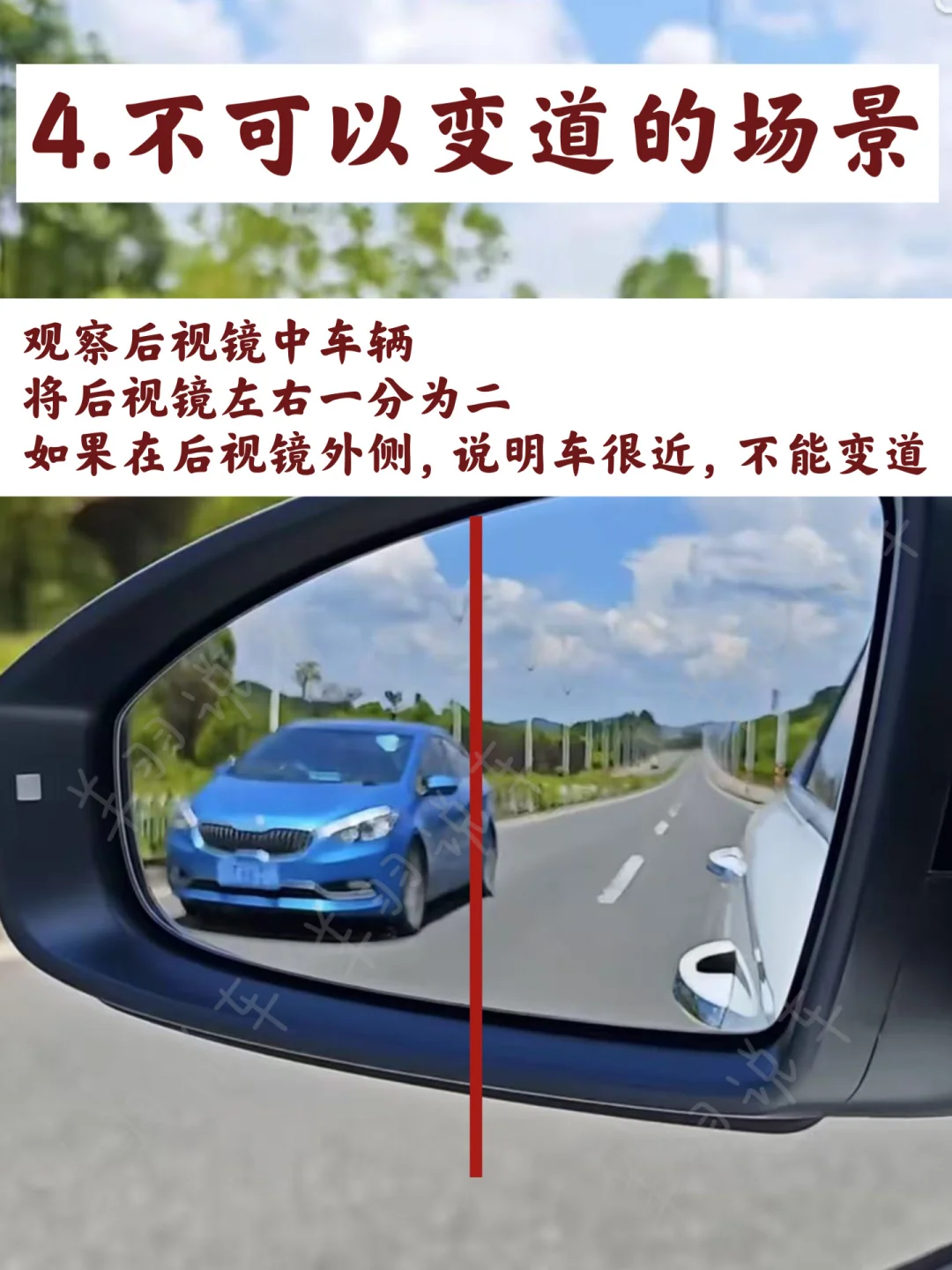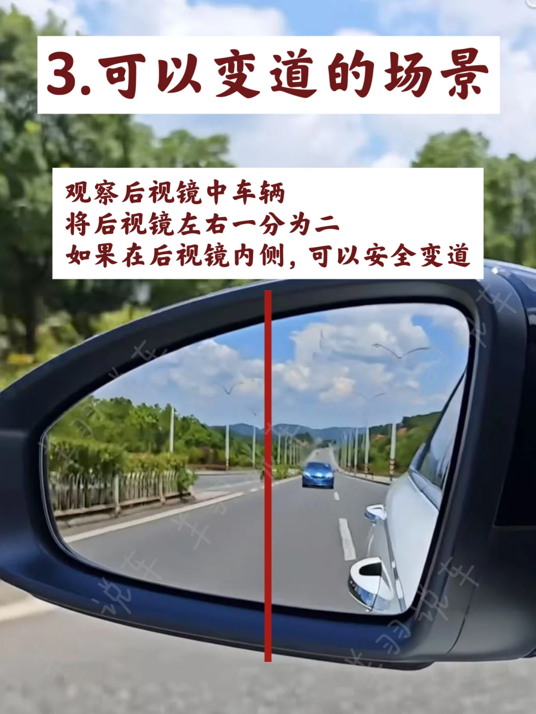 将后视镜一分为二,通过后视镜观察后方车辆的位置,如果车辆在后视镜内半侧,则可以安全变道,如果车辆位于后视镜的外半侧,此时车非常近,不建议变道。