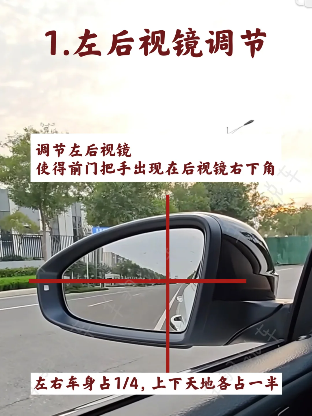 调节左后视镜,使得前门把手出现在后视镜的右下角,此时视野更佳。