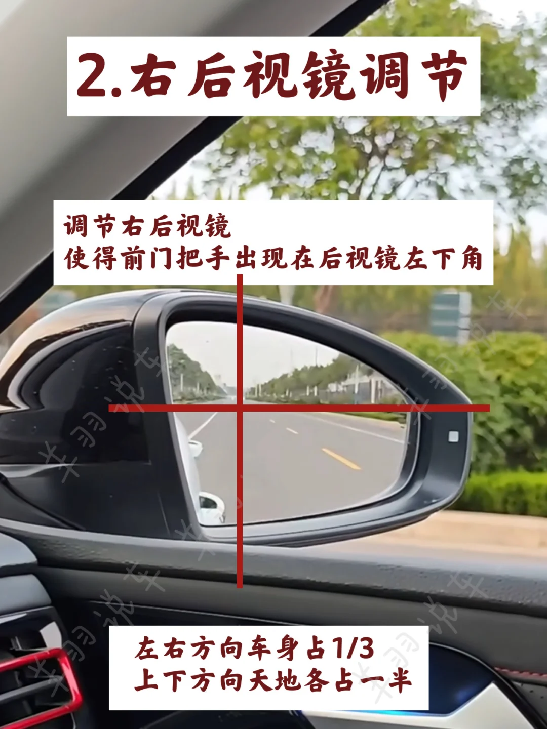 调节右后视镜,使得前门把手出现在后视镜的左下角,此时视野更佳。